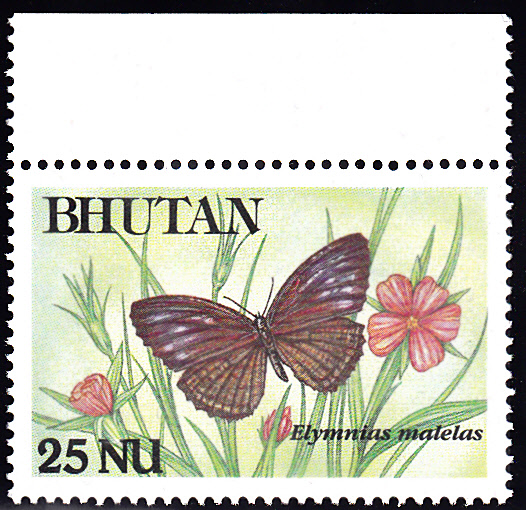 Diese Marke aus Bhutan (MiNr 1253) stellt uns einen Elymnias malelas vor.