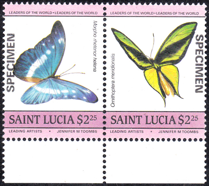 In St.Lucia ist in einer Serie auch eine Marke (MiNr 738) mit einem Falter der Unterart Morpho rhetenor helena erschienen. Hier zeige ich eine Mustermarke dieser Ausgabe: