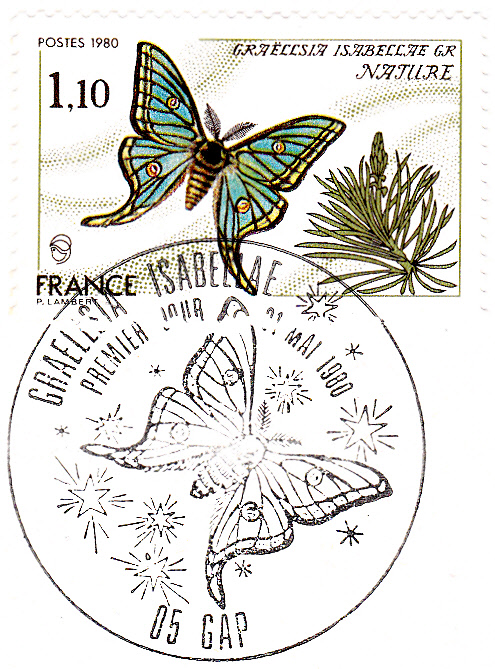 Hier eine Marke aus Frankreich (MiNr 2208) mit einem Isabellaspinner (Graellsia isabellae).
