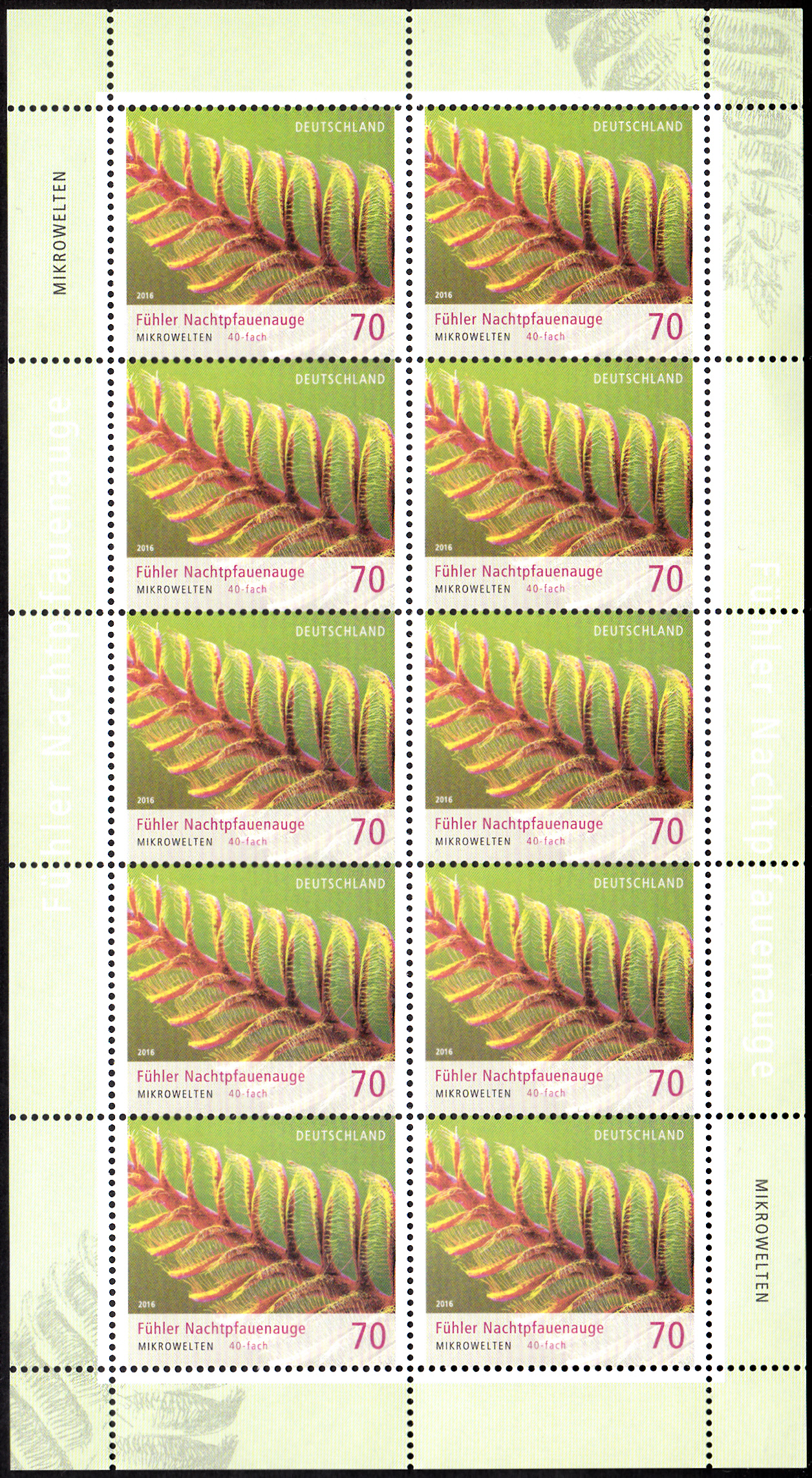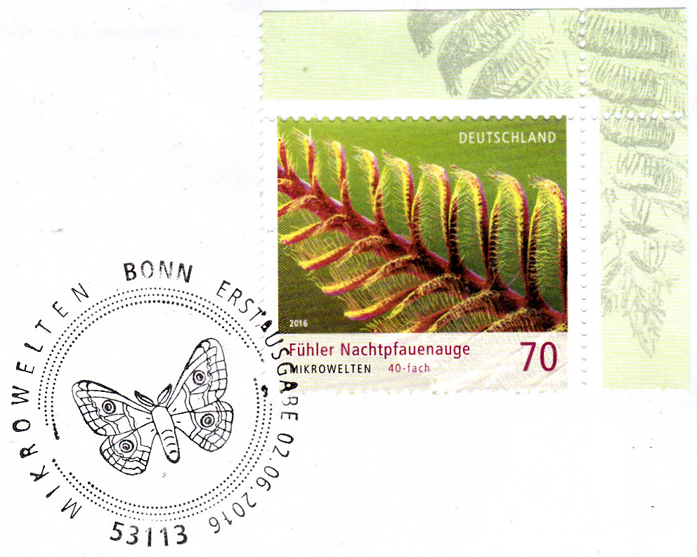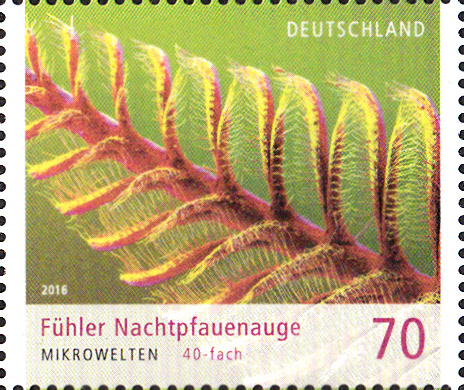 Auf dieser Marke der Deutschen Bundespost (MiNr 3246) wird ein Fühler eines Nachtpfauenauges in 40-facher Vergrößerung gezeigt.