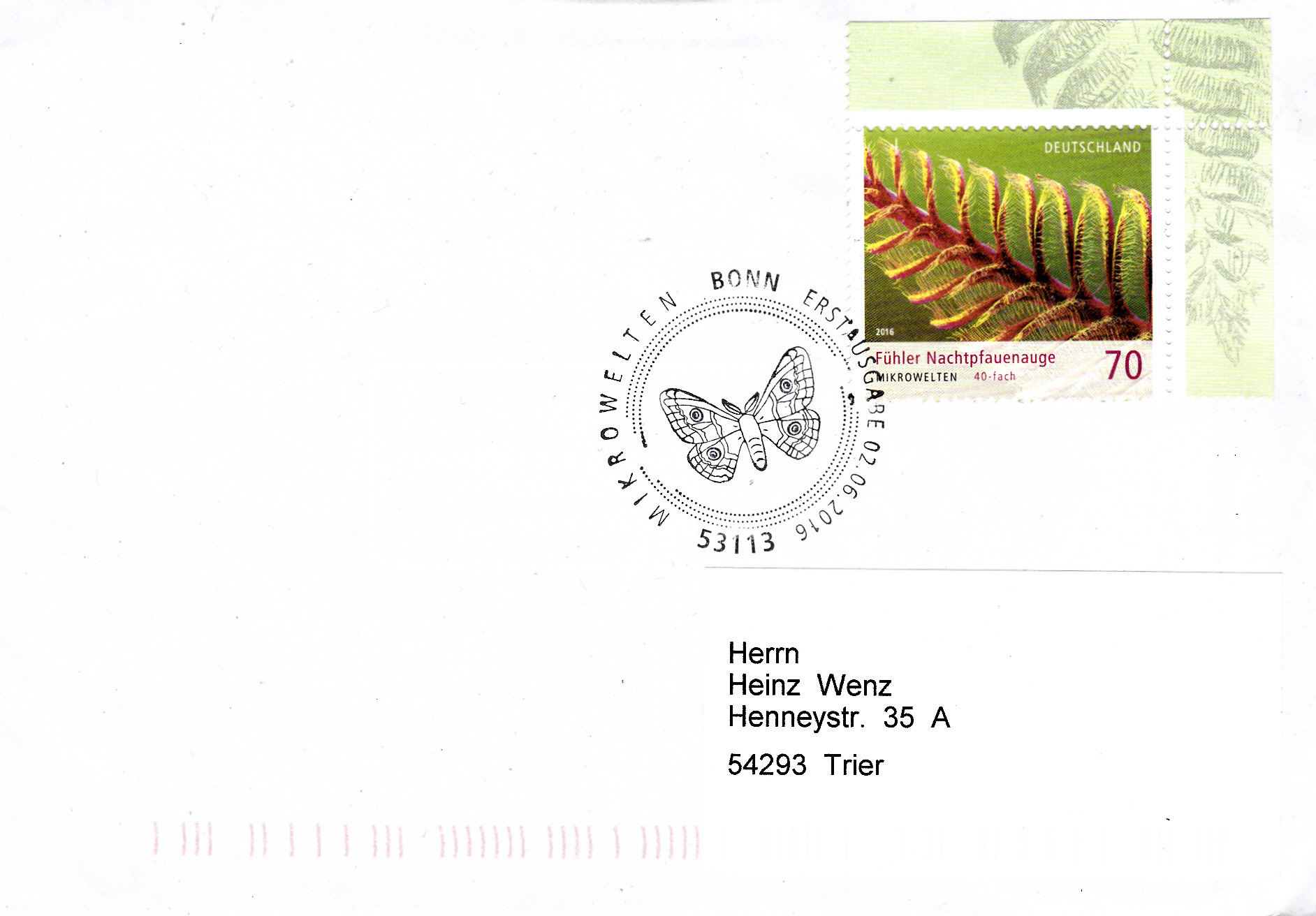 Im Ersttagsonderstempel Bonn zu dieser Ausgabe wird auch ein Kleines Nachtpfauenauge im Stempelbild gezeigt.