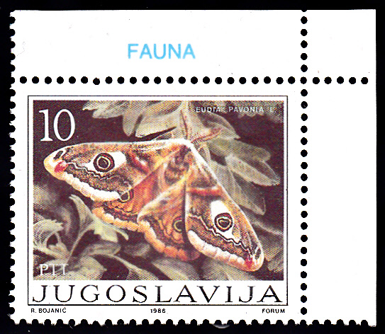 Diese Marke aus Jugoslawien (MiNr 2171) zeigt ein Kleines Nachtpfauenauge (Eudia pavonia).