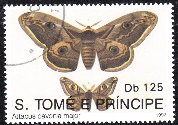 Auf dieser Marke aus São Tomé und Príncipe (MiNr 1386) wird das Kleine Nachtpfauenauge (Saturnia pavonis) gezeigt.