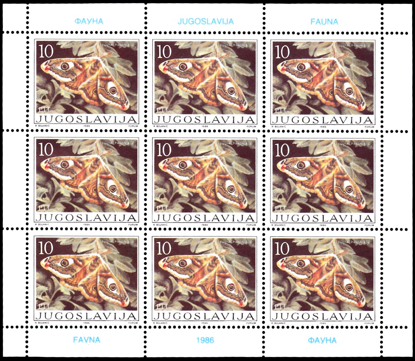 Die bereits gezeigte Marke aus Jugoslawien (MiNr 2171) mit einem Kleinen Nachtpfauenauge (Eudia pavonia) ist als Kleinbogen mit 9 Marken erschienen. Heute kann ich hier auch einen kompletten Kleinbogen zeigen.