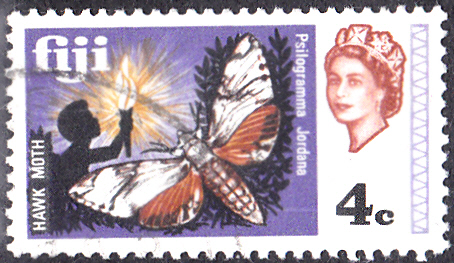 Auf einer Marke der Fidschi-Inseln (MiNr 235) wird ein Jordanschwärmer (Psilogramma jordana) gezeigt.