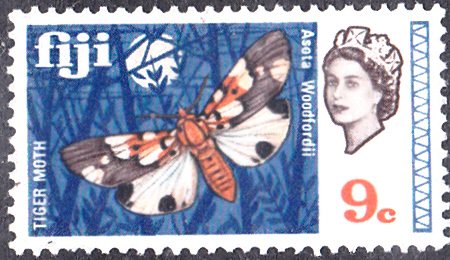 Auf dieser Marke der Fidschi-Inseln (MiNr 239) wird ein Asota Woodfordi gezeigt.