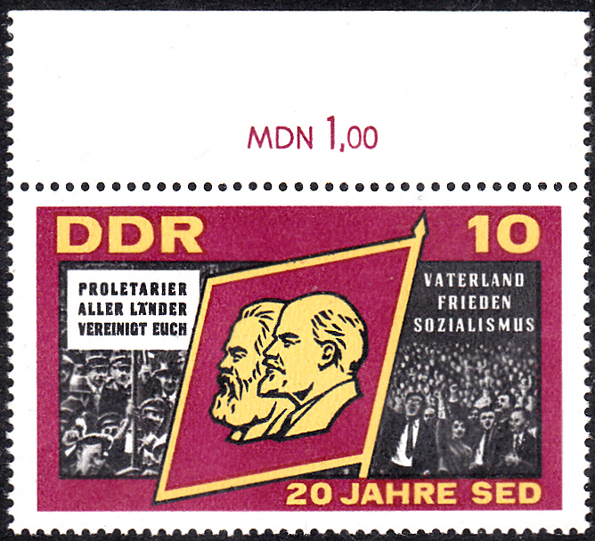 Auf der 10Pf-Marke der DDR (MiNr 1174) zum Jubiläum "20 Jahre Sozialistische Einheitspartei Deutschlands" wird neben einer Demonstration auch eine Fahne mit Kopfbildern von K. Marx und W. I. Lenin gezeigt.