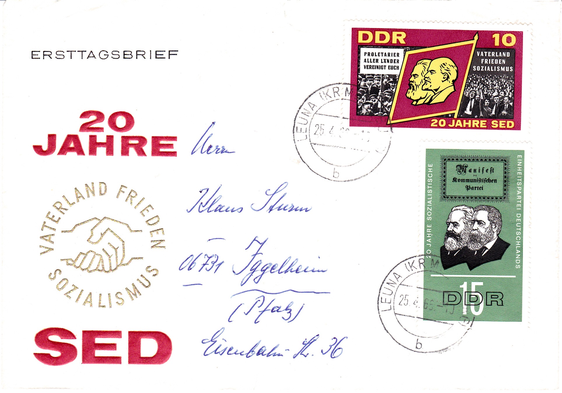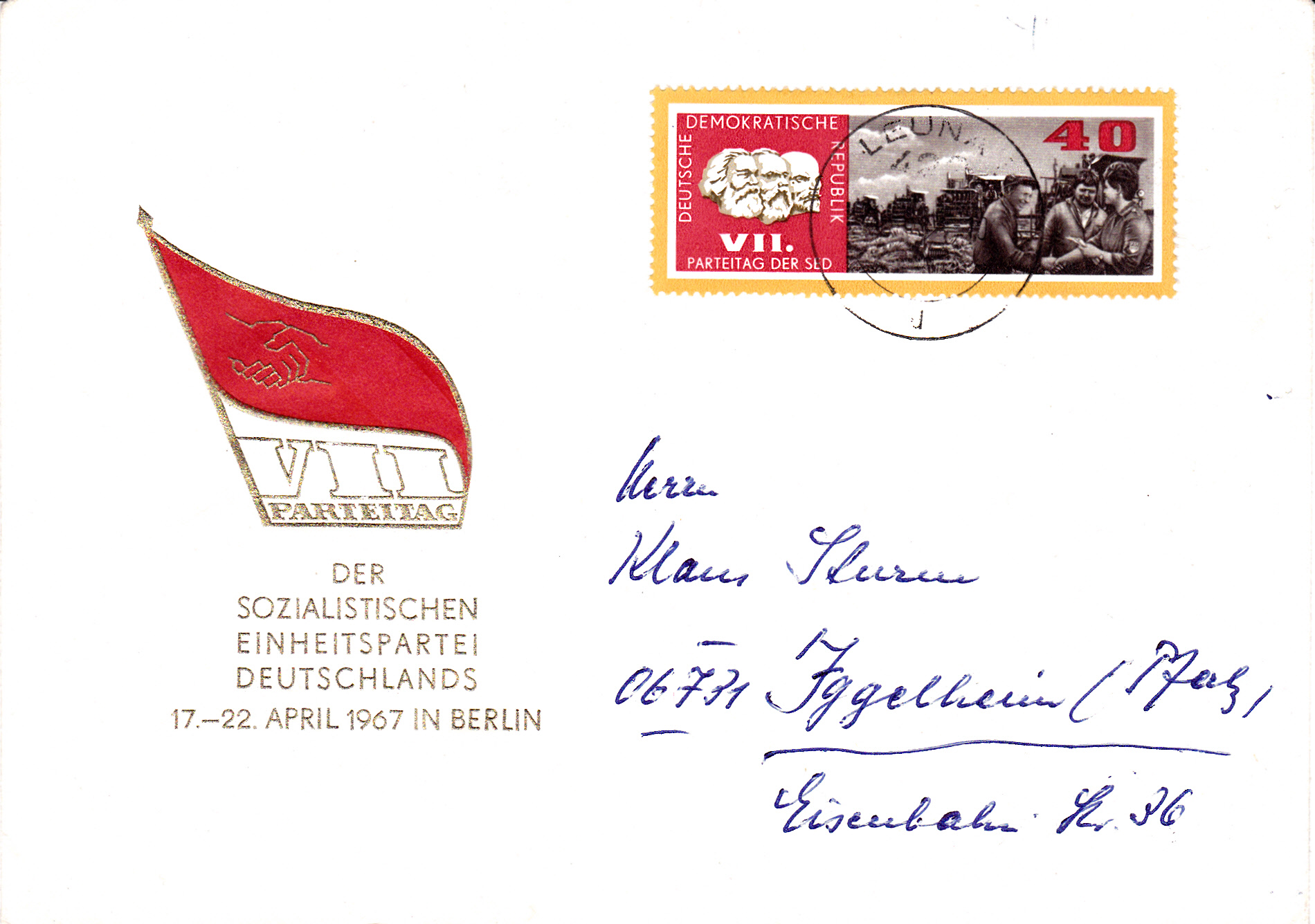 Zum Parteitag der Sozialistischen Einheitspartei Deutschlands (SED) im Jahre 1967 erschien in einer Serie diese Marke zu 10 Pfennig (Minr 1258) mit dem Regiepult einer Chemie-Anlage und den Kopfbildern von Marx, Engels und Lenin.