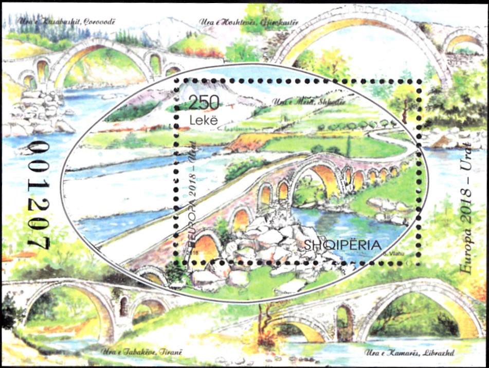 In Albanien erschien neben einer Europamarke 2018 zum Gemeinschaftsthema "Brücken" am 25.10.2018 auch noch ein Block mit einer Marke. Hier zeige ich diesen Block zu 200 Lek mit einer Abbildung der Brücke von Mes aus dem 18. Jahrhundert.
