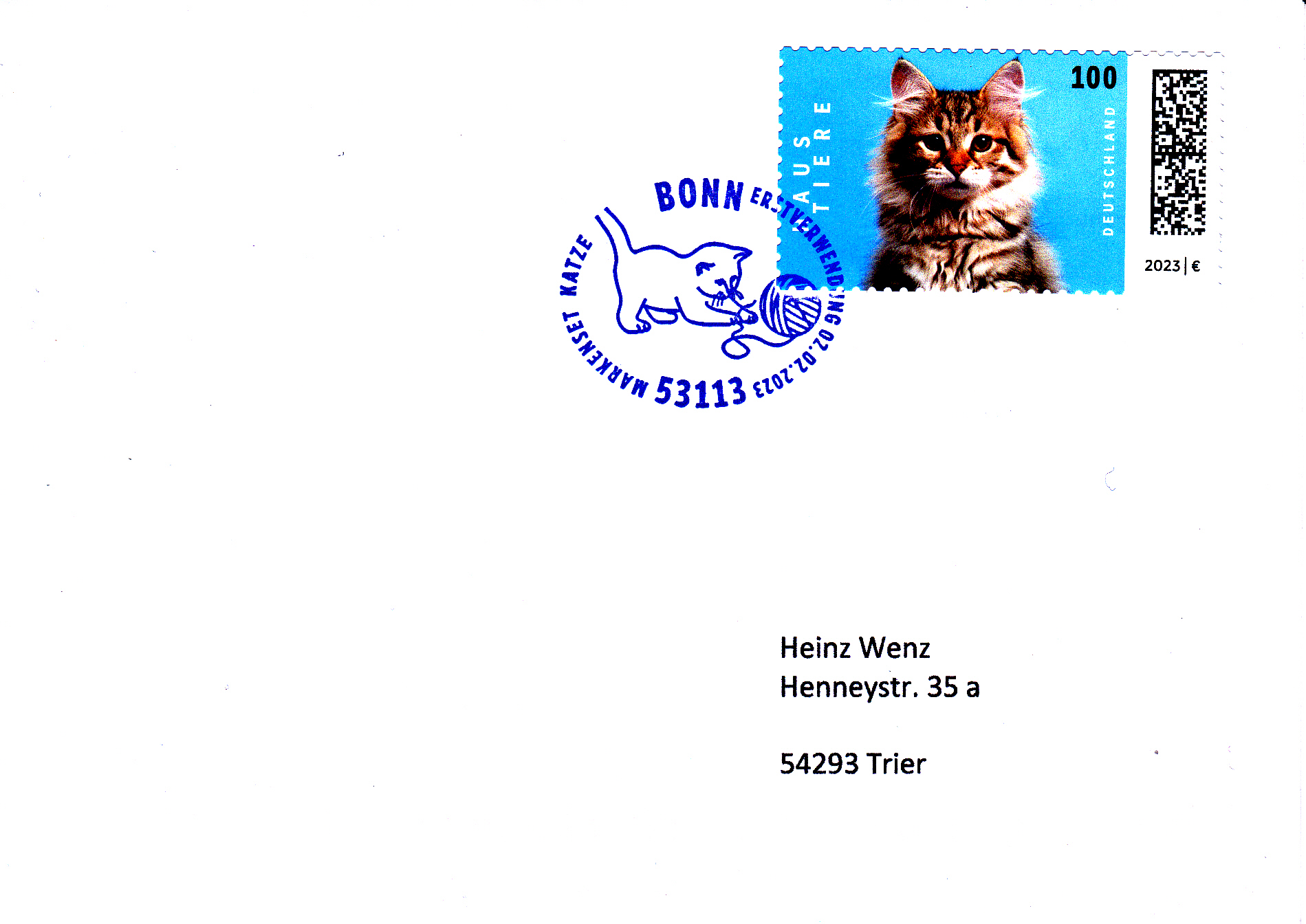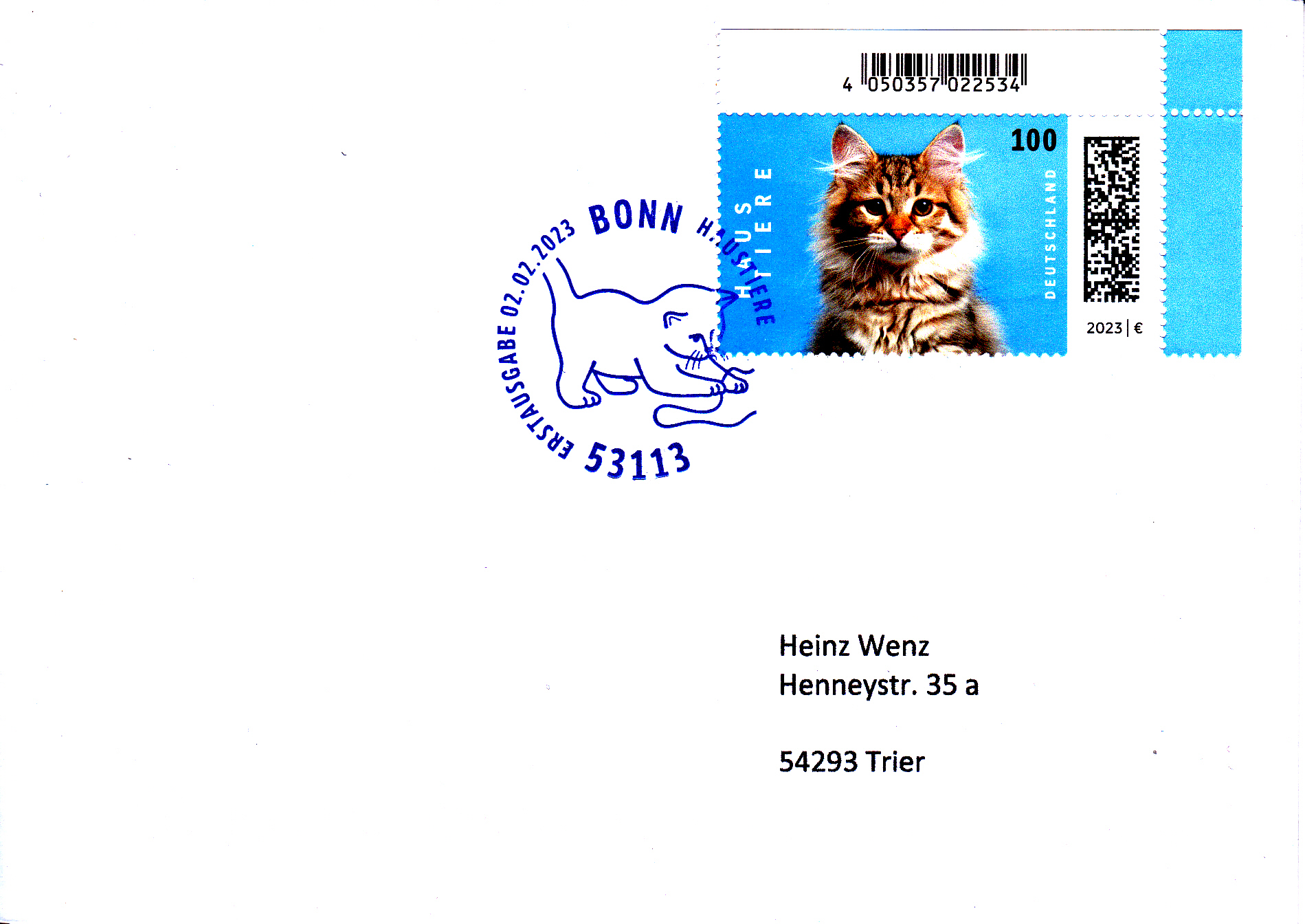 Auf einer Marke der Deutschen Post (MiNr 3748) aus der Serie "Haustiere" sehen wir eine Sibirische Katze (Felis catus). Hier zeige ich eine Marke vom Eckrand mit EAN-Codierung.