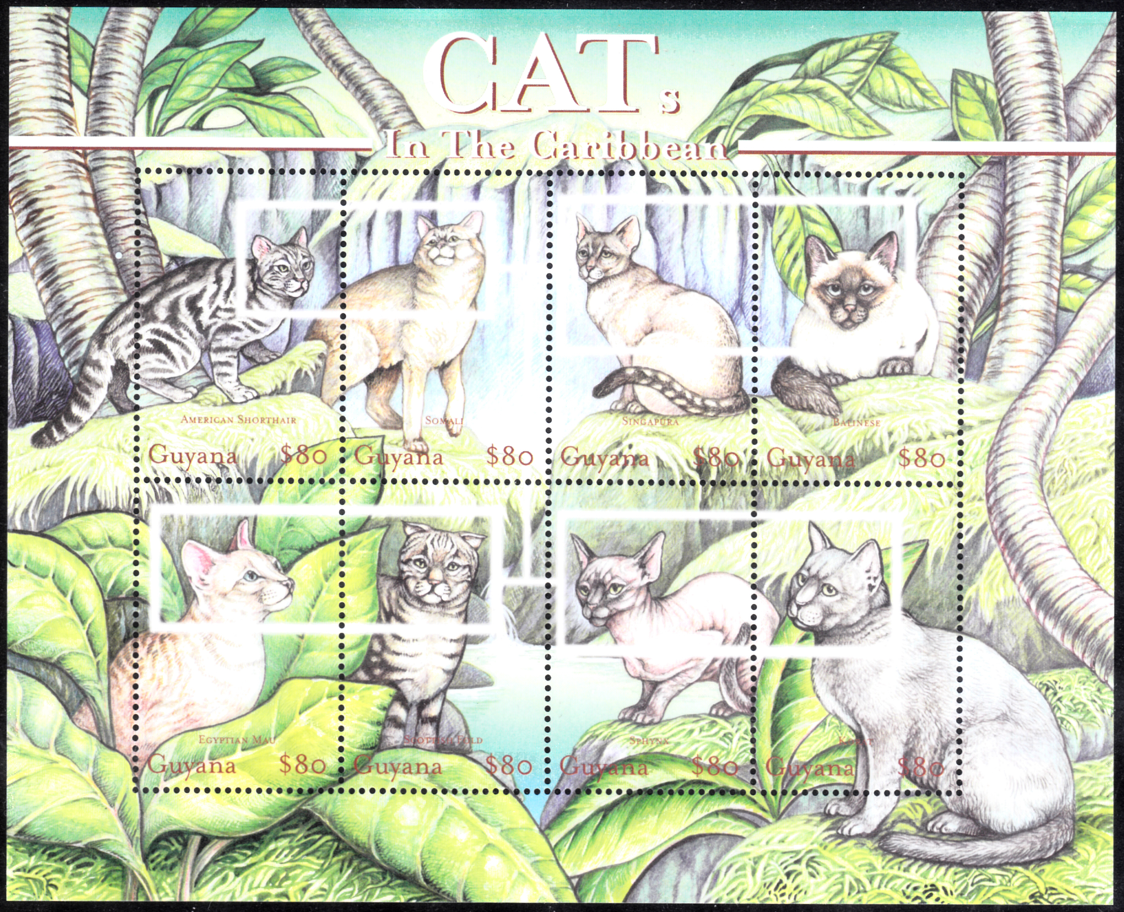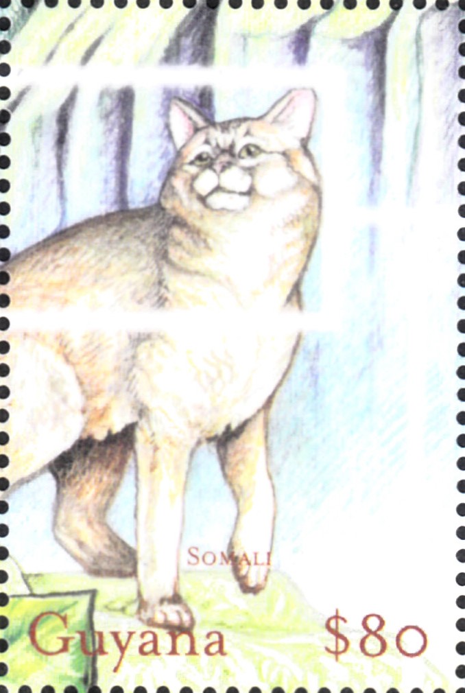 Eine Marke aus Guyana (MiNr 7137) bildet eine Somalikatze ab.