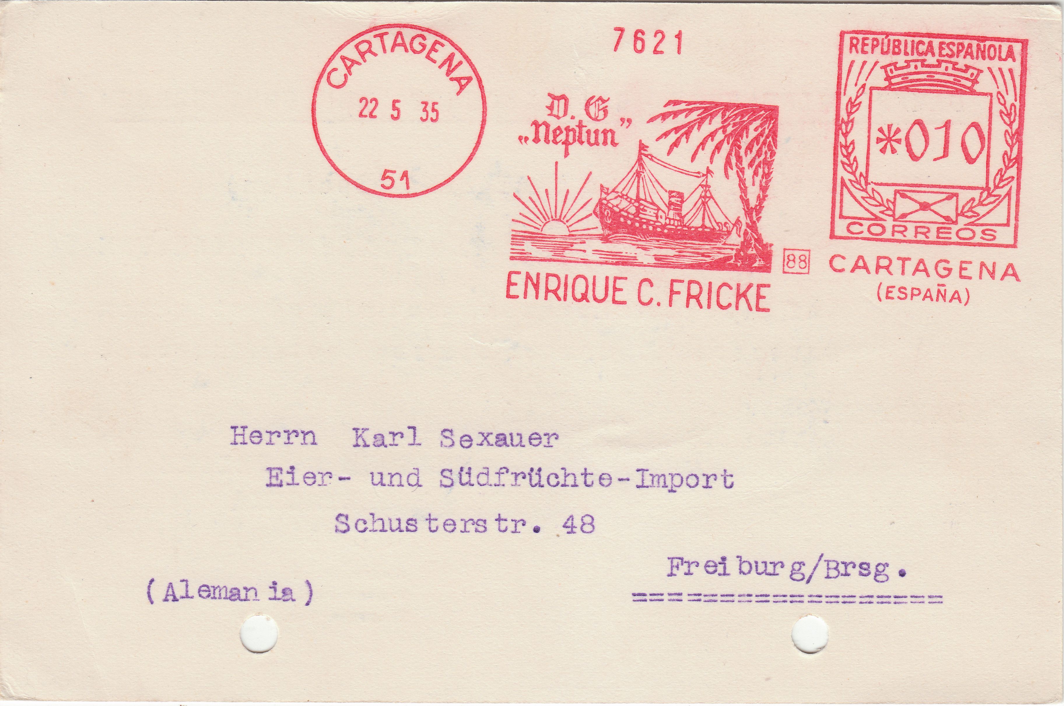 1919, 15. November, Entlassung seitens des Admiralstabes der Marine. Gründung der Firma Enrique C. Fricke, die sich heute befasst mit Im- und Export von und nach Deutschland, mit der Vertretung allererster Firmen der deutschen Bankwelt, Schwerindustrie, Maschinerieindustrie und chemischen Produkten. Hauptagentur der Dampfschiffarts-Gesellschaft „Neptun“, Bremen, für den Ostspaniendienst. Besondere Abteilung für die Erzausfuhr. In Murcia eigene Filiale unter derselben Firma für die Apfelsinenausfuhr. Heute beschäftigt die Firma Enrique C. Fricke über 100 Angestellte, darunter sechs deutsche Herren, einschliesslich vier Kriegsoffiziere, alle verwundet.