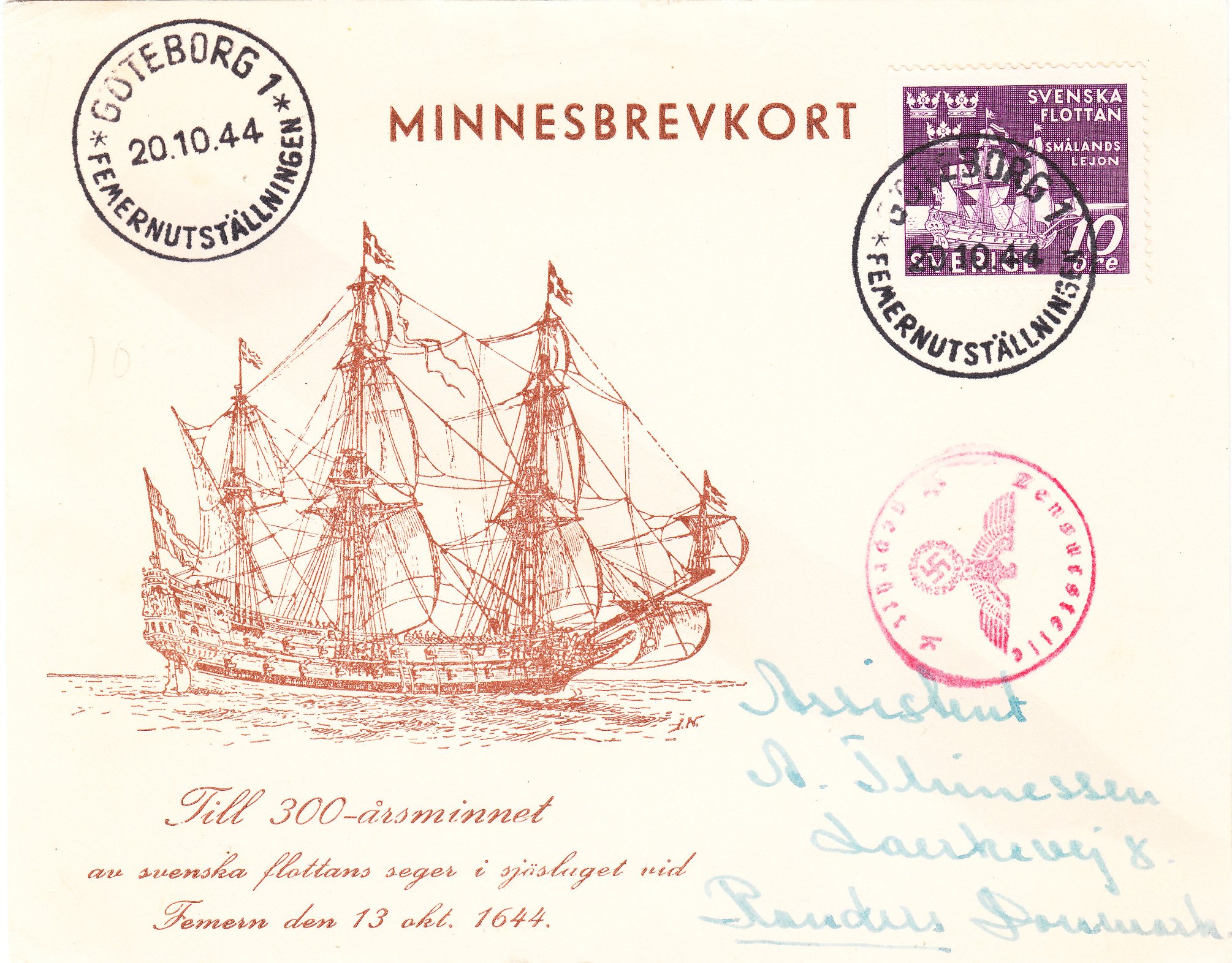 Diese nach Dänemark adressierte, am 20.10.1944 in Göteborg in Schweden aufgegebene Postkarte lief durch die ABP Kopenhagen in Sonderburg und erhielt dort den von Oktober 1944 bis April 1945 eingesetzten seltenen Handprüfstempel "Zensurstelle k geprüft k", Landsmann KP5.1, mit Durchmesser 27 mm in Rot.