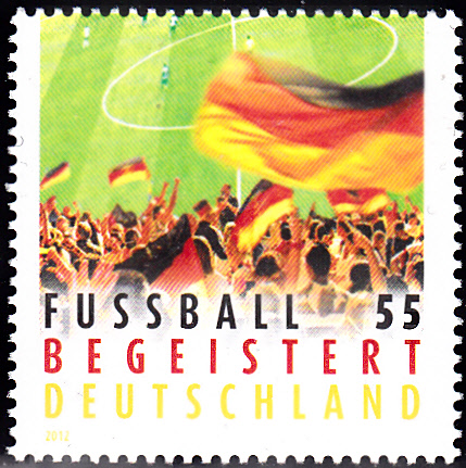 Die im Jahre 2012 erschienene Marke "Fußball begeistert Deutschland" (MiNr 2930) zeigt Anhänger der deutschen Fußball-Nationalmannschaft beim "Public Viewing".