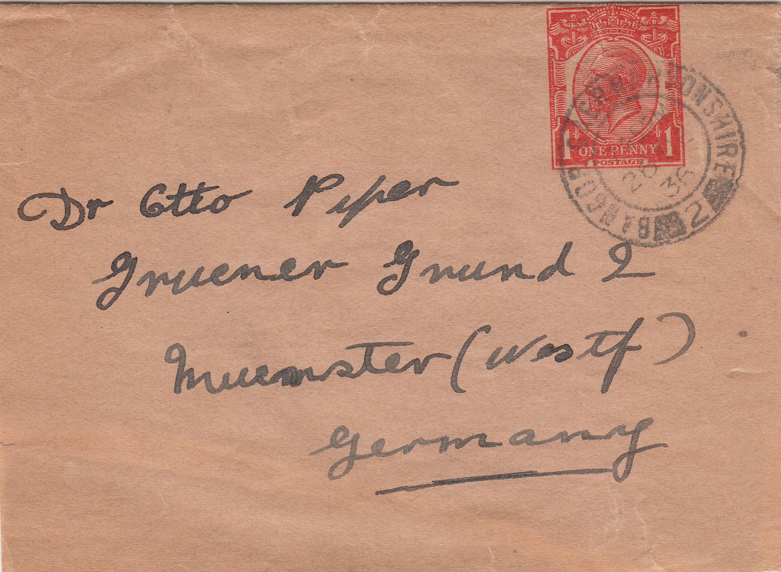 Als erstes Beispiel britischer Postgeschichte hier eine Ganzsache in Form eines Streifbands mit Eindruck eines Postwertzeichens der Freimarkenserie König George V., gebraucht am 26.12.1936 in BANGOR CAERNARVONSHIRE: