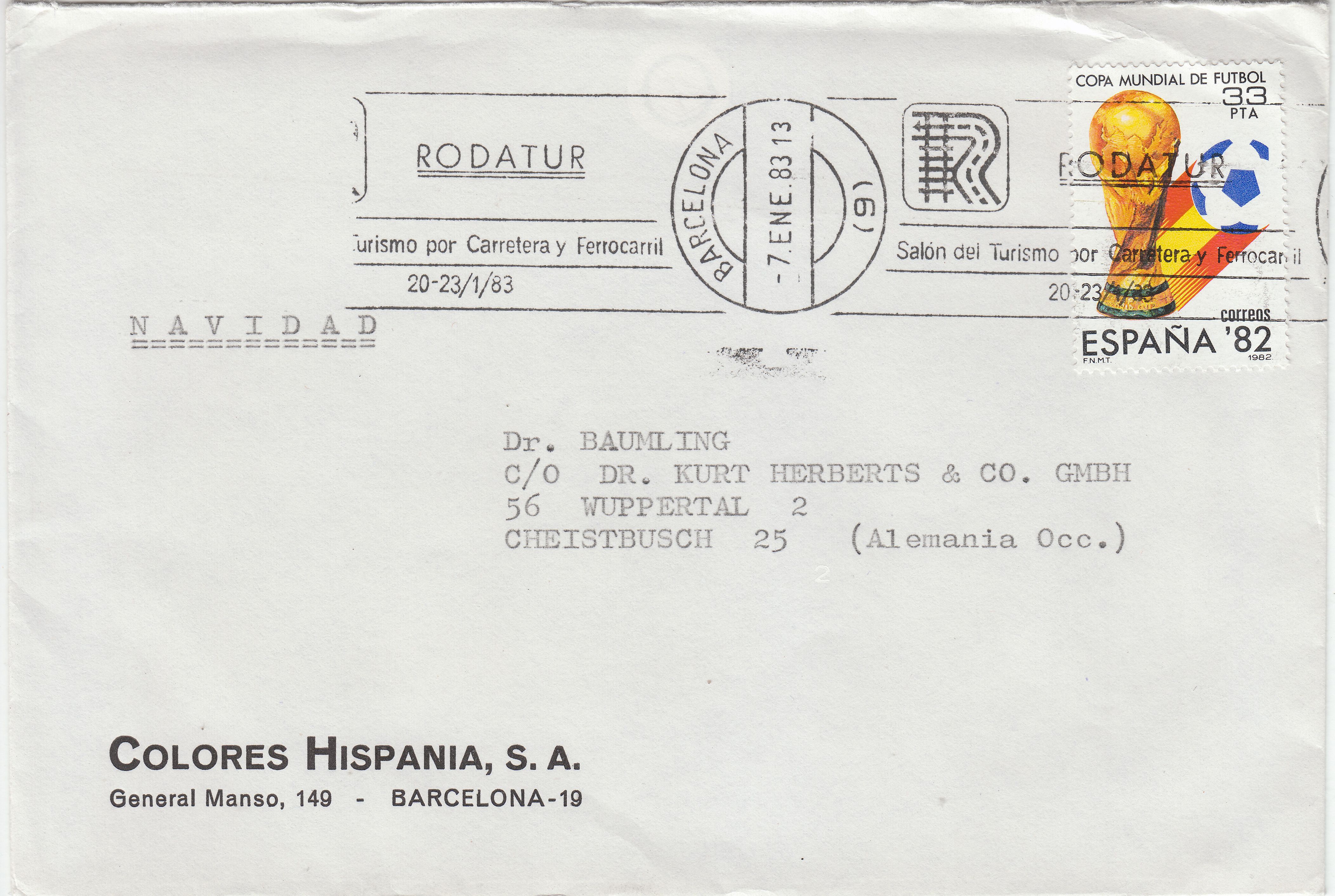Zum heutigen Achtelfinale zeige ich Euch aus Spanien einen Brief nach Deutschland mit einer Einzelfrankatur einer zur Fussball-WM 1982 erschienenen Sondermarke, MiNr. 2533, aufgegeben am 07.01.1983 in Barcelona: