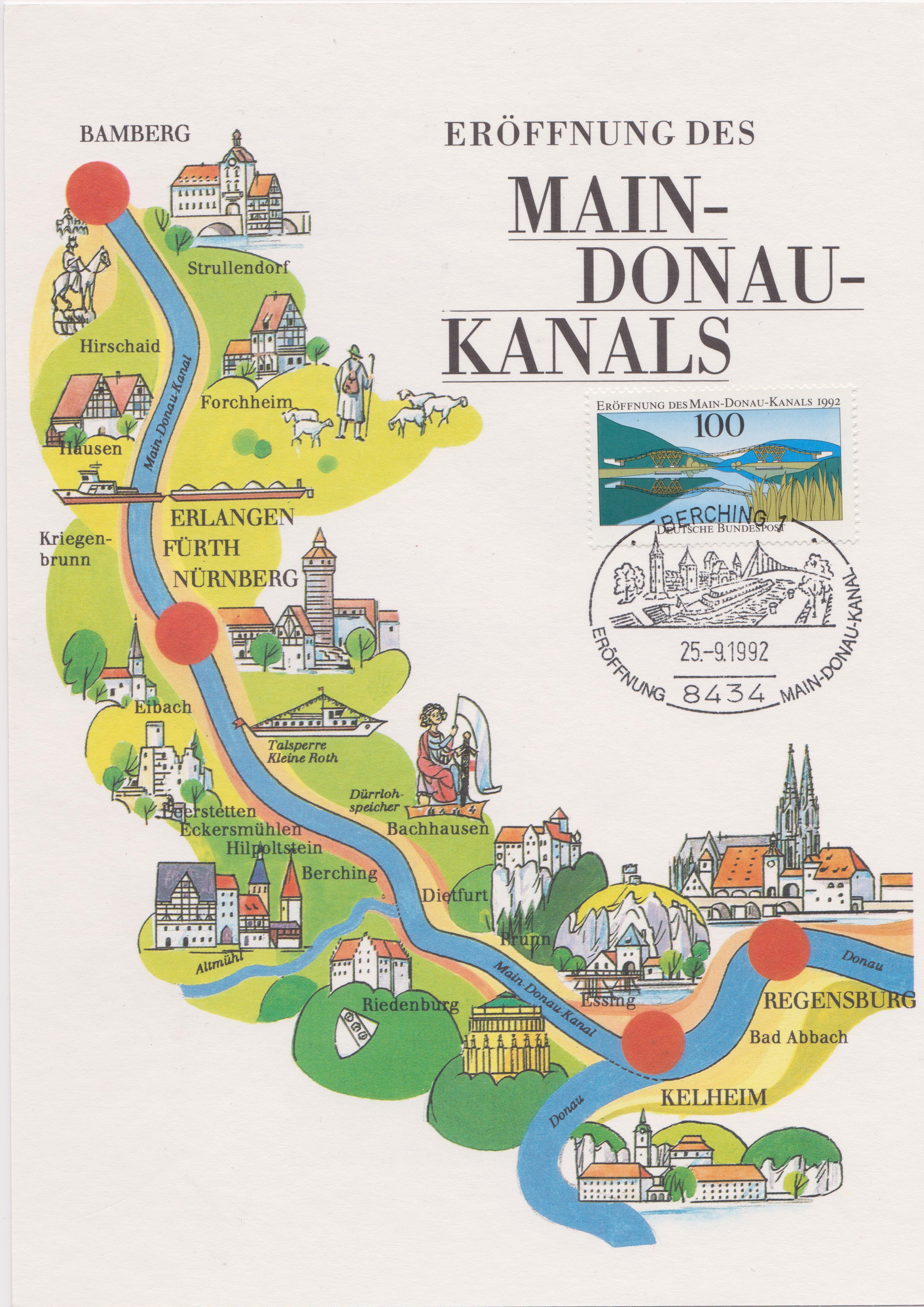 Zur Eröffnung des Main-Donau-Kanals erschien am 10.09.1992 die Sondermarke Bund MiNr. 1630, die am 25.09.1992 in 8434 BERCHING 1 mit einem passenden Sonderstempel versehen wurde: