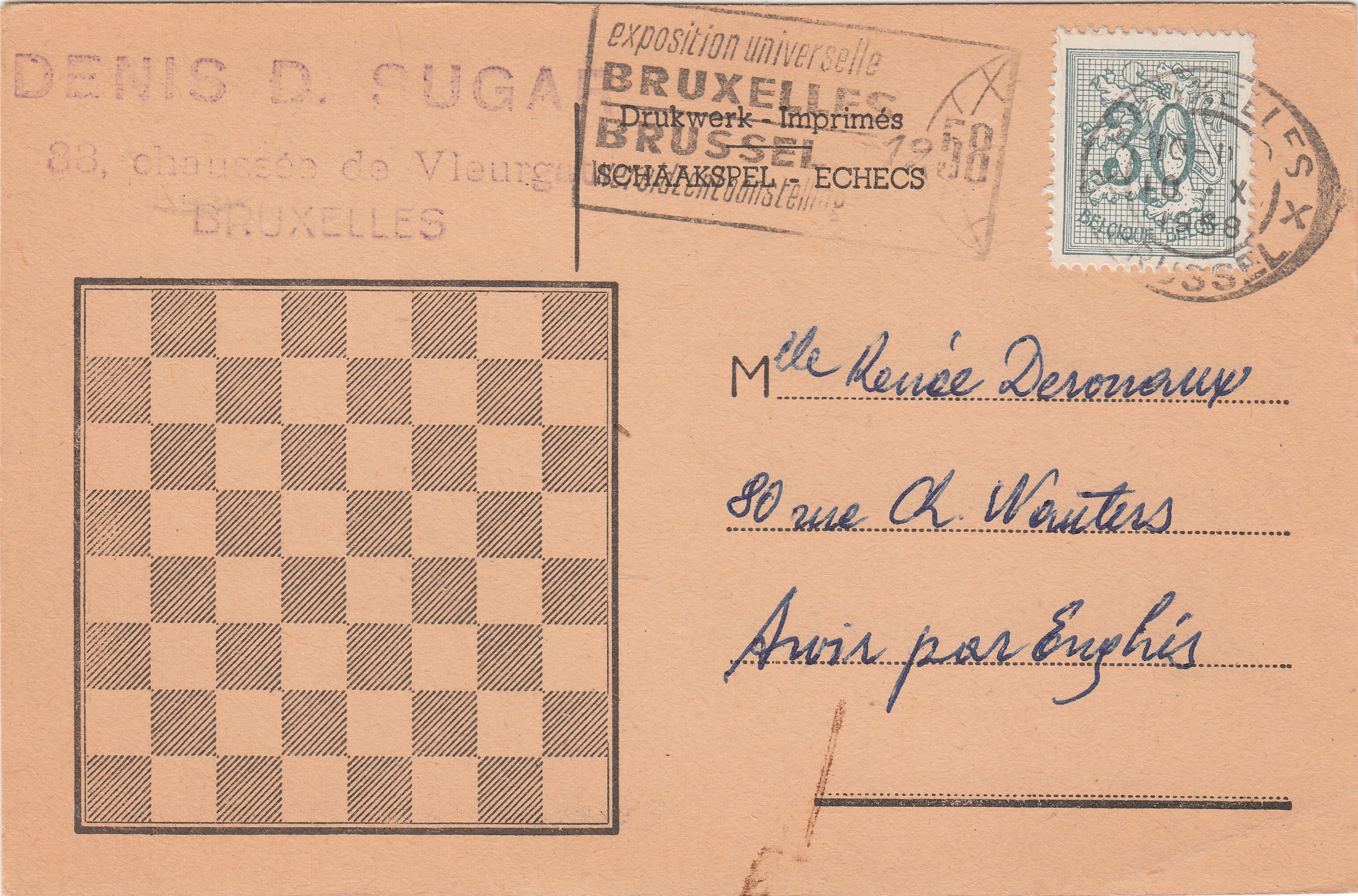 Diese Drucksache aus einer Fernschachkorrespondenz zeigt einen Maschinenstempel mit Werbeeinsatz zur Weltausstellung in Brüssel 1958: