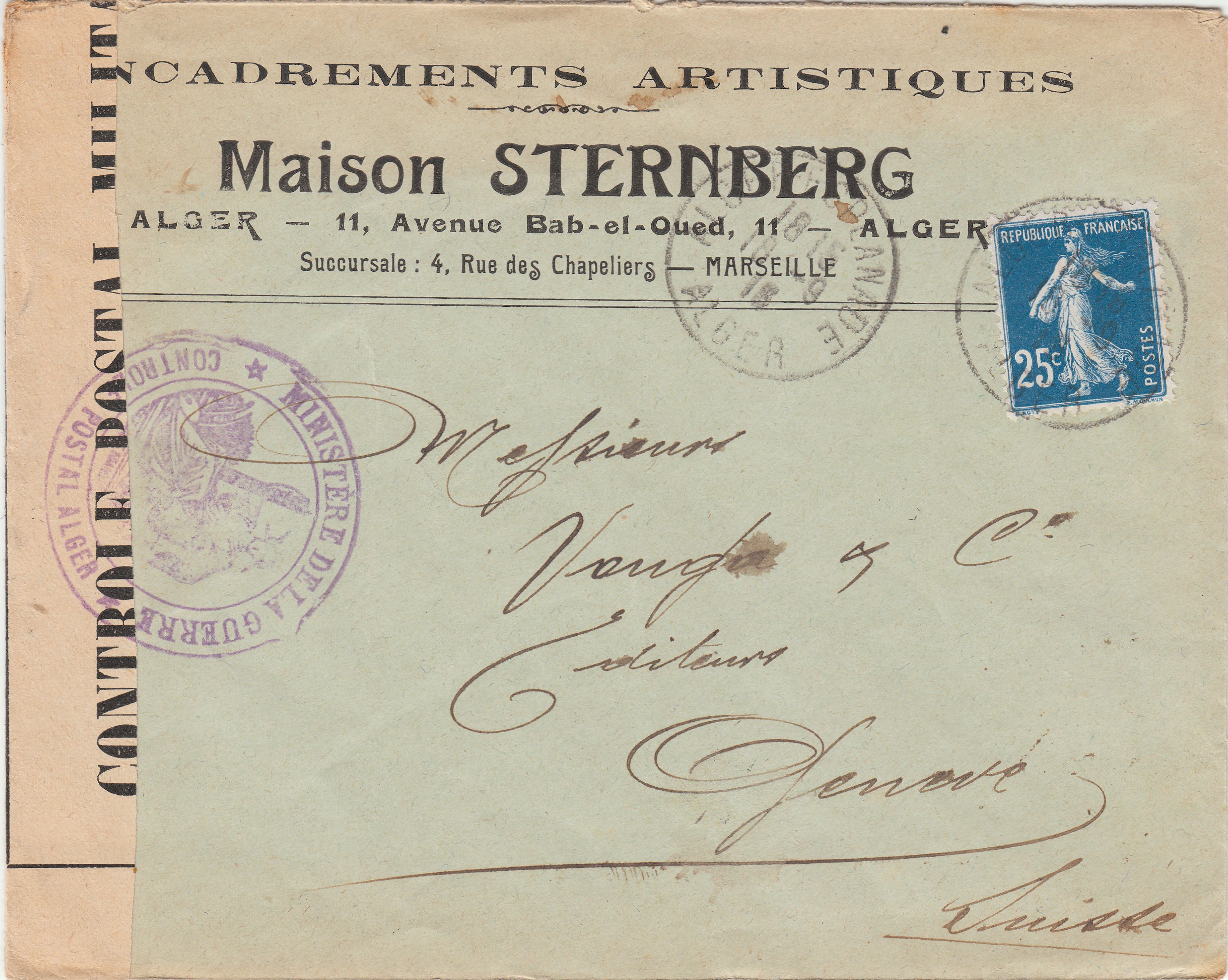 Der Beleg durchlief die Zensurstelle in Algier, wo er linksseitig geöffnet und nach erfolgter Prüfung mit einem Verschlußzettel "CONTROLE POSTAL MILITAIRE" wieder verschlossen wurde, was vorderseitig ein Zweikreisstempel "MINISTÈRE DE LA GUERRE CONTROLE POSTAL ALGER" sowie rückseitig ein Rechteckstempel "OUVERT PAR L'AUTORITÉ MILITAIRE" dokumentieren. Der Brief kam in Genf am 27.09.1916 an.
