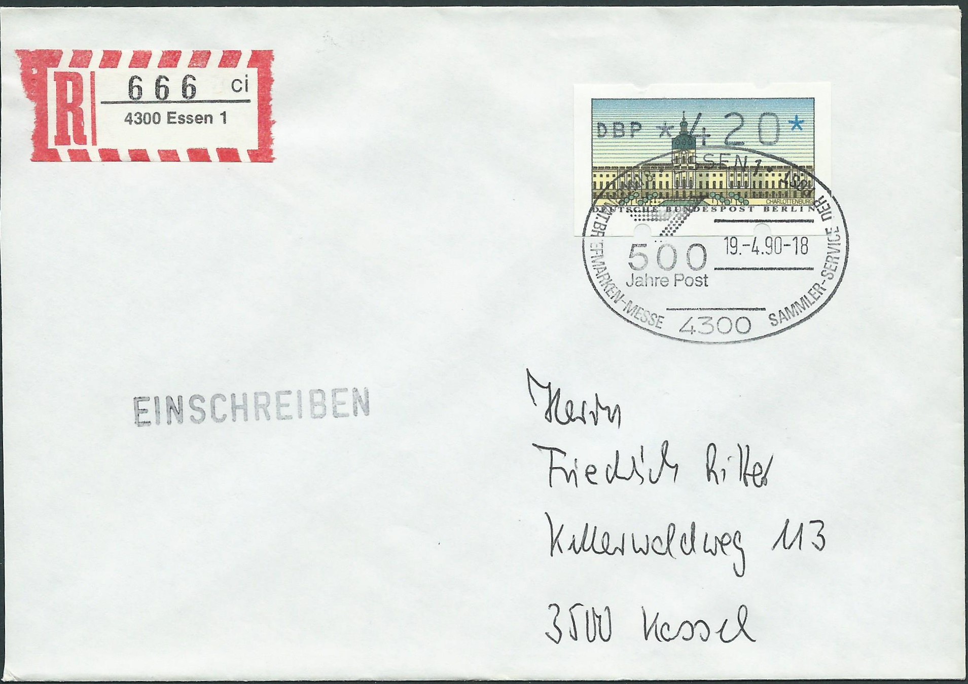Eine schöne Einzelfrankatur mit einem hohen Wert nimmt man auch gerne in der Sammlung auf: Eine Automatenmarke der Wertstufe 420 Pf auf einem Einschreib-Brief, gestempelt 19.4.90 in Essen. Der Tarif setzt sich aus 170 Pf für den Brief ab 20 bis 50 gr. und 250 Pf für Einschreiben zusammen. Der Sonderstempel verrät, dass der Brief seinerzeit auf der Briefmarkenmesse Essen aufgegeben wurde. Und genau dort habe ich ihn am 7.5.2015 (also fast genau 25 Jahre später) aus einer Grabbelkiste für 40 ct gezogen :D