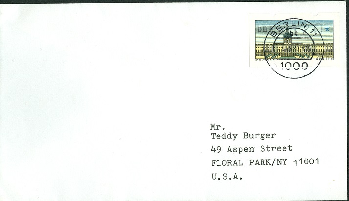 Ein Ersttagsbeleg mit der Berliner Automatenmarke in die USA. Korrekt mit 120 Pfennigen frankiert. Natürlich könnte es sich auch um eine so genannte "Nachbeschriftung" mittels Schreibmaschine handeln.