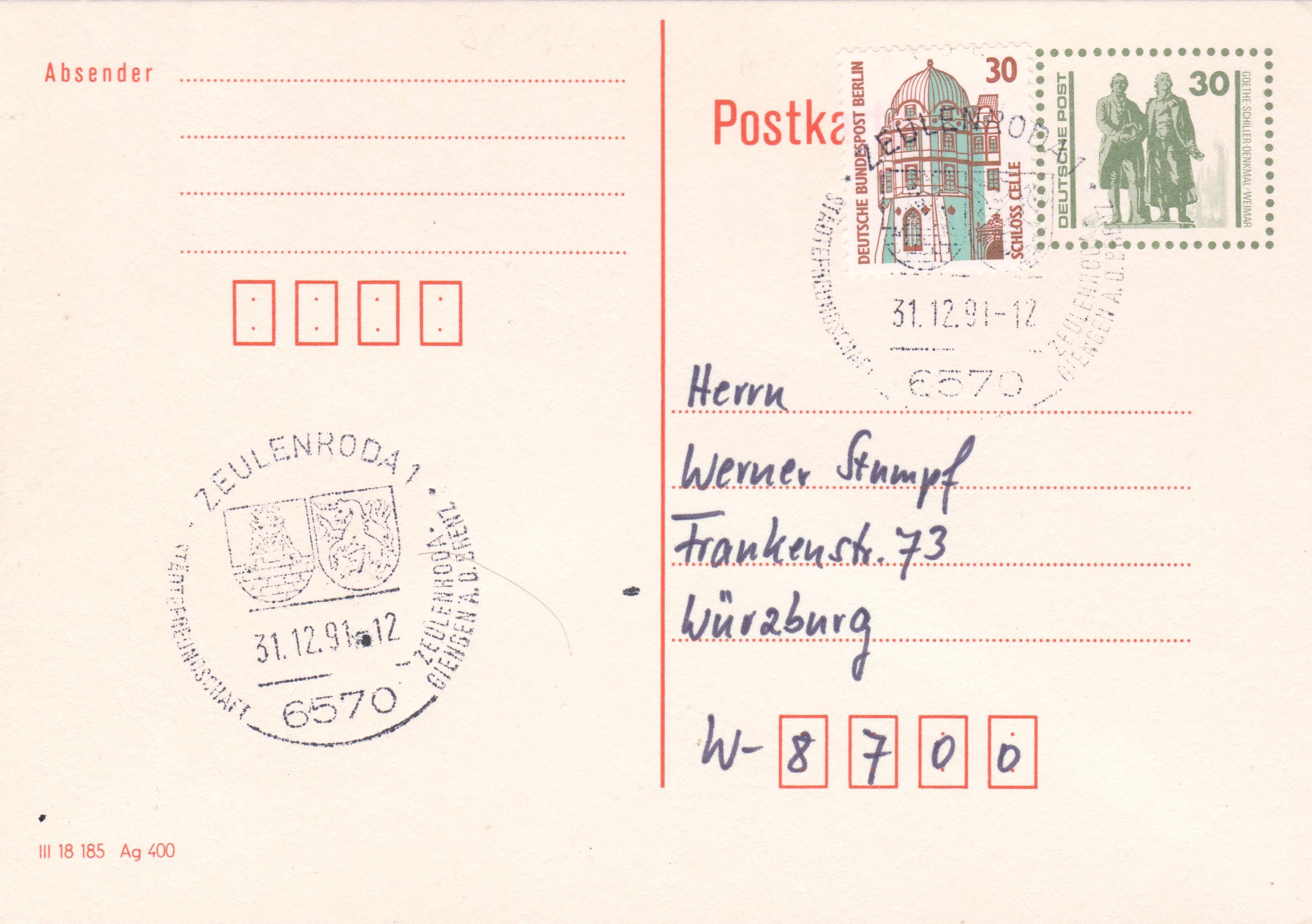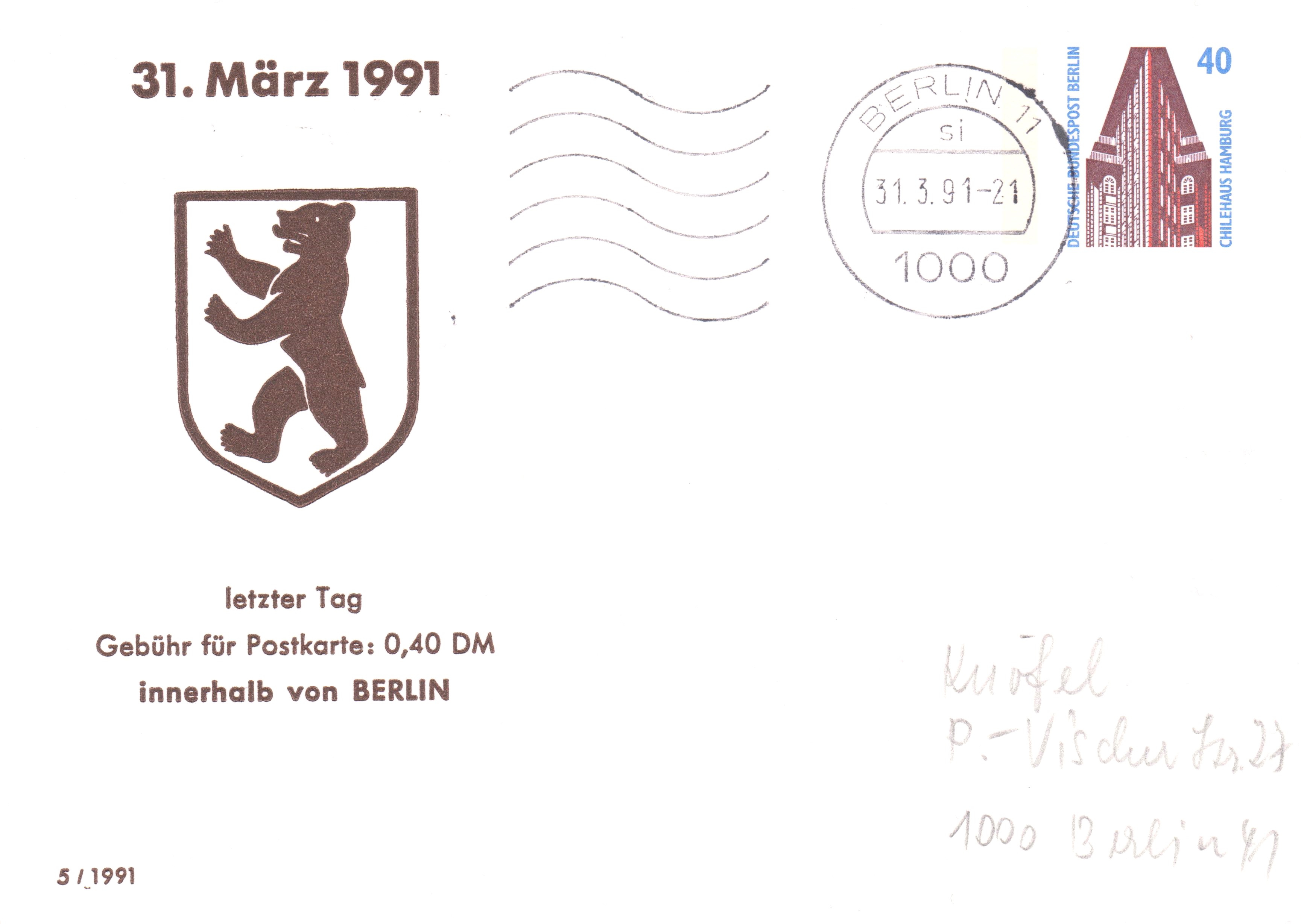 Ganzsachenpostkarte 40 Pf zum 31.03.1991 als letztem Gültigkeitstag der Dauerserie Sehenswürdigkeiten, Ausgabe Berlin: