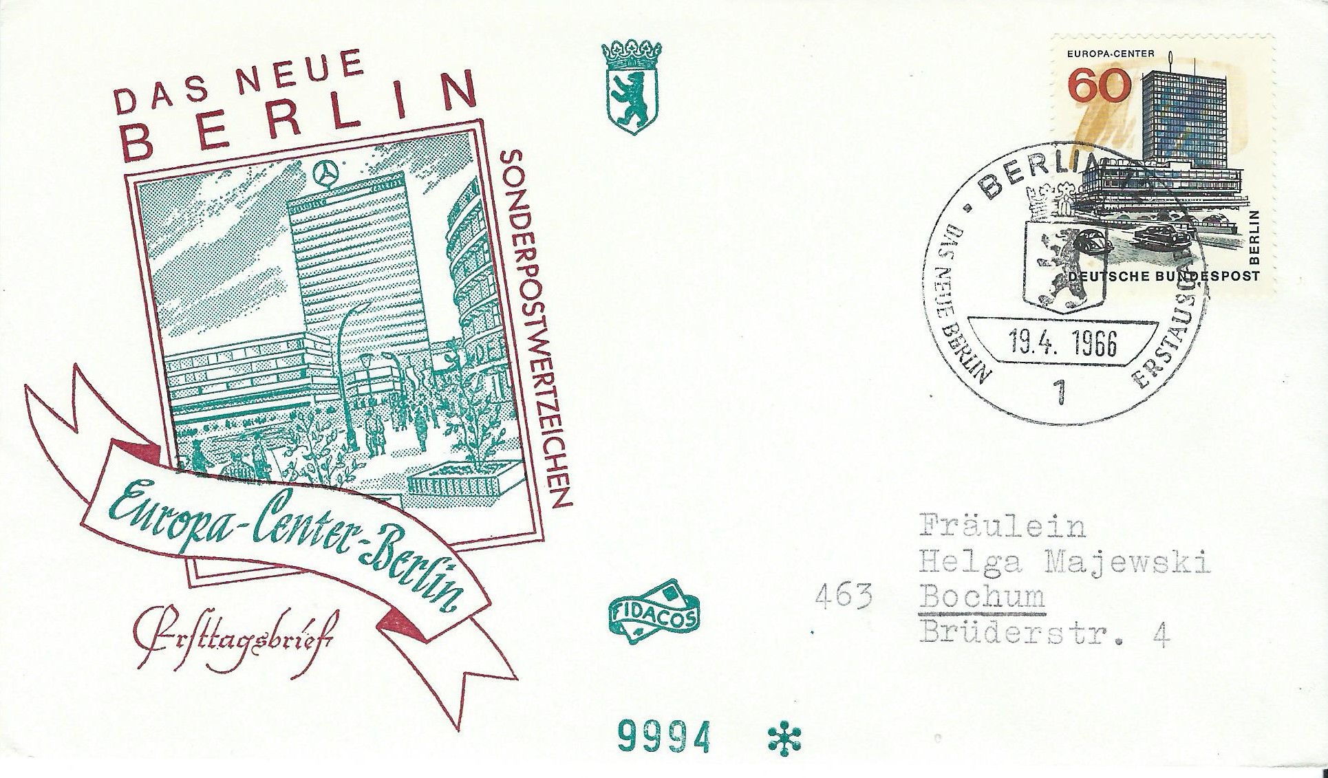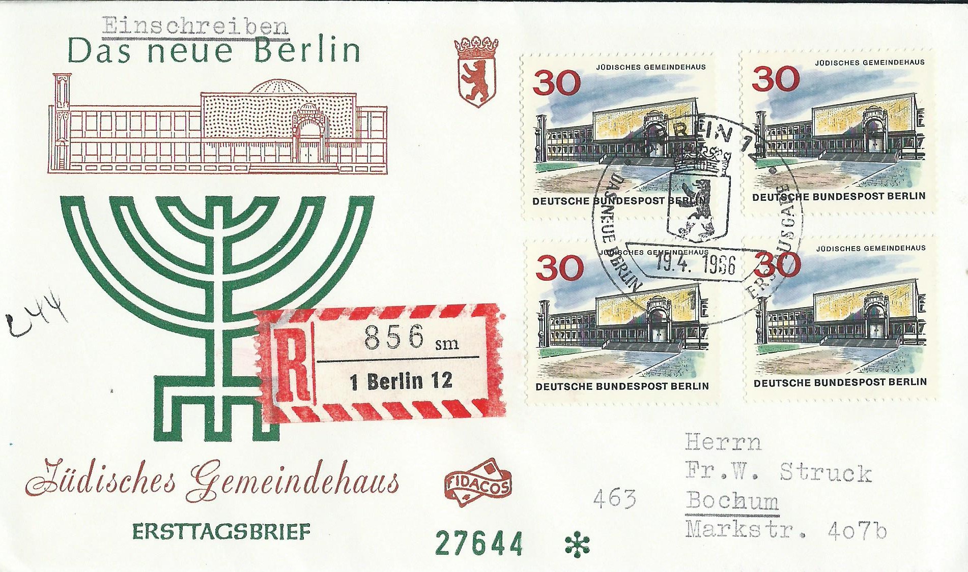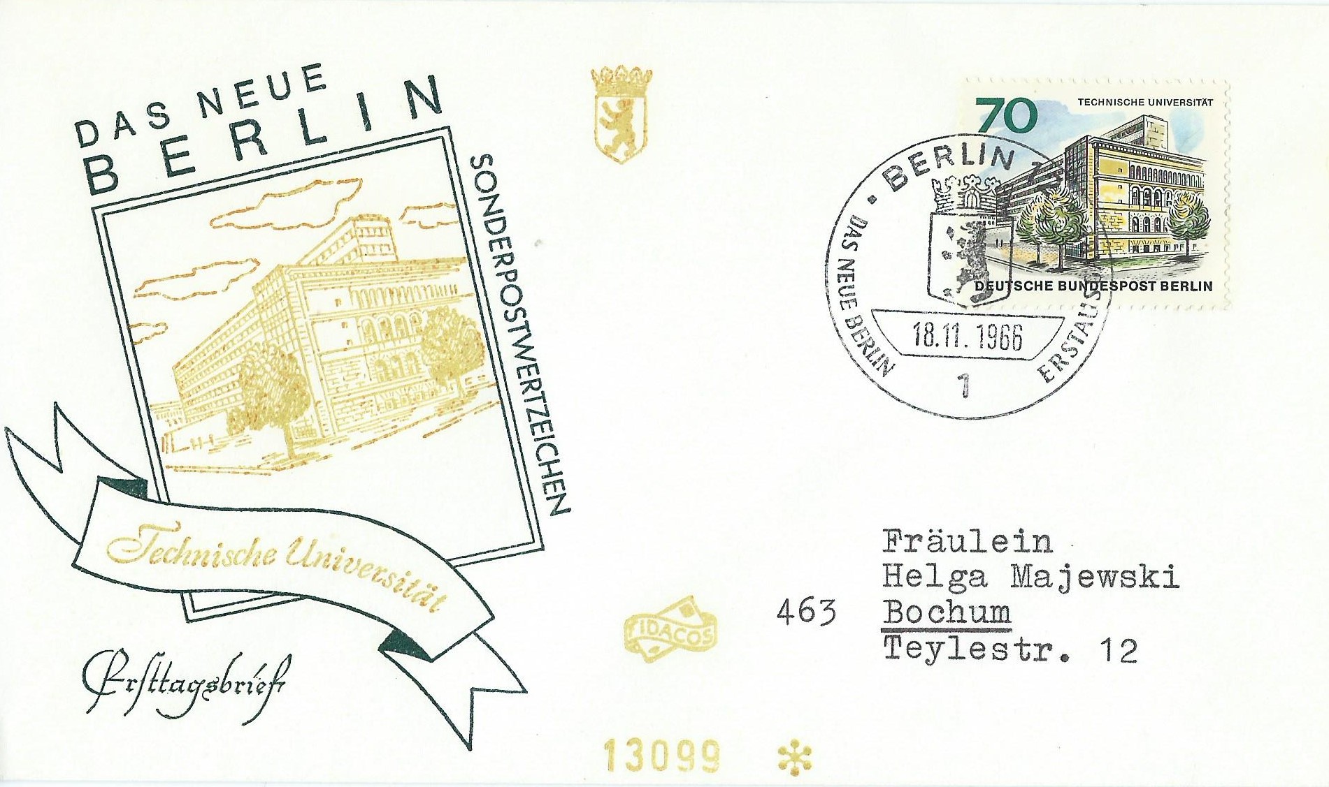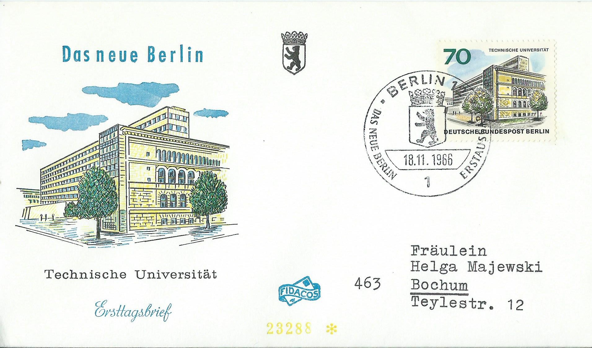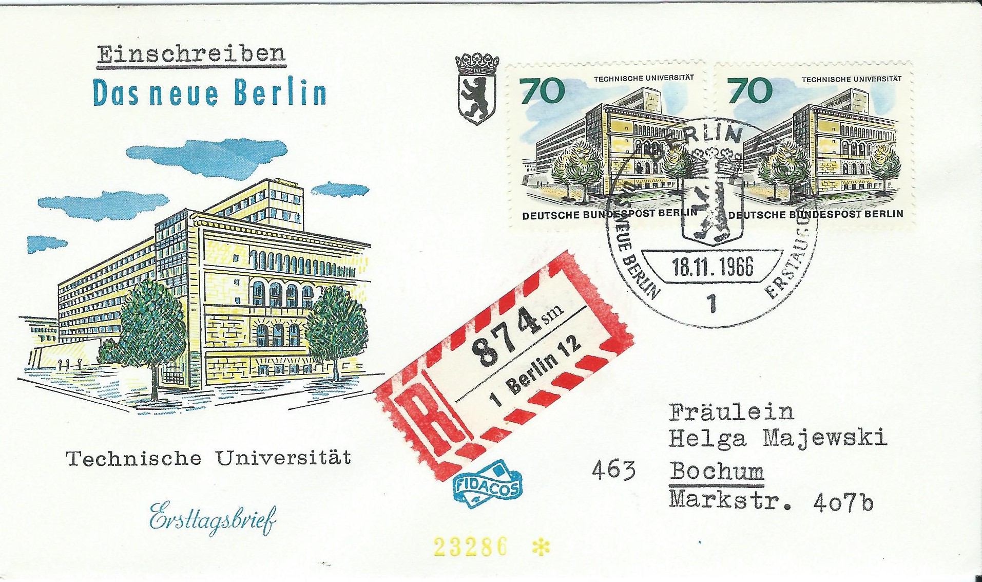 Dazu noch ein blanko-Umschlag ohne Zudruck, auch wieder als Einschreiben mit 2 Einzelmarken und mit dem Ersttagssonderstempel Berlin am 18.11.66 gestempelt.