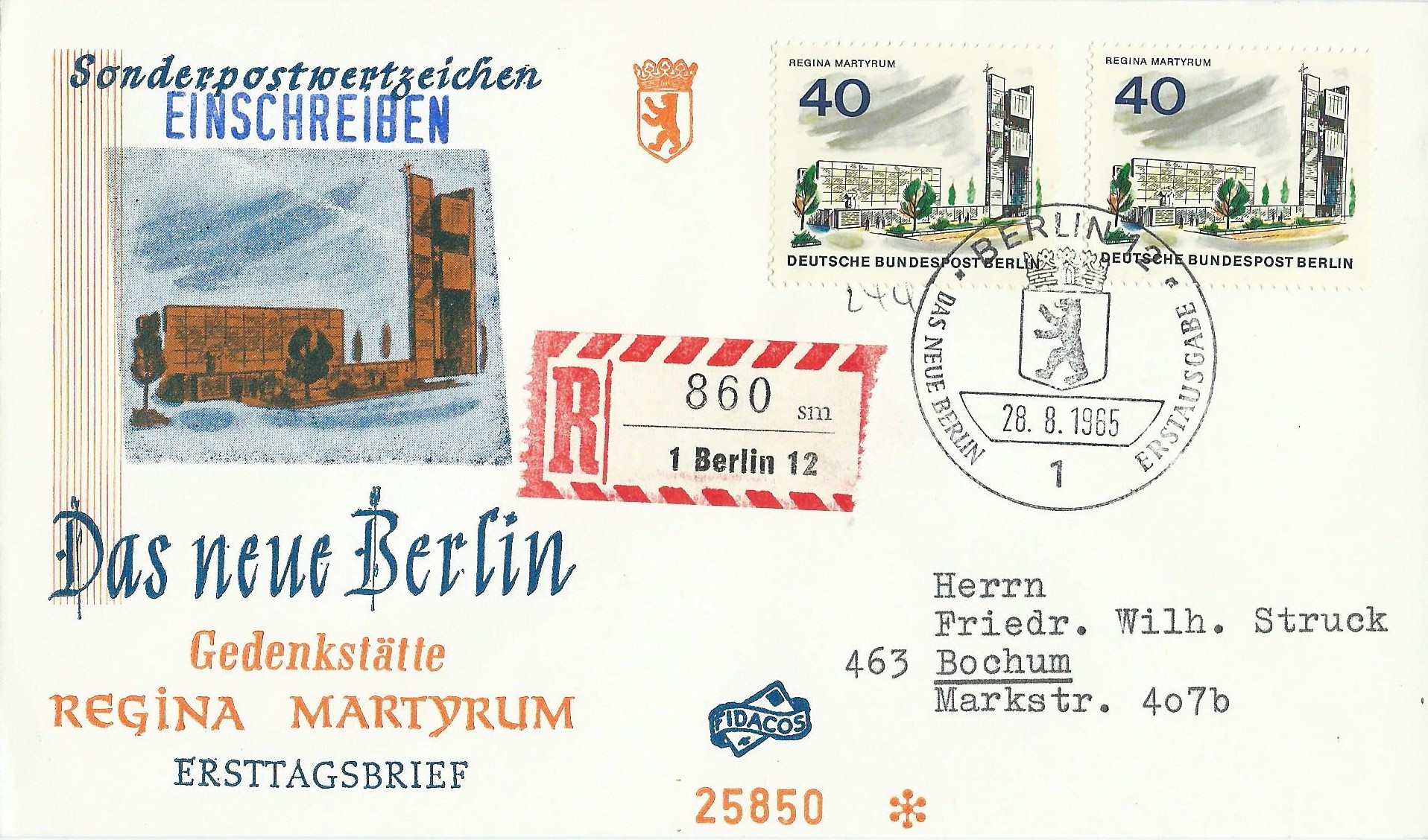 Der Wert zu 40 Pf Gedenkstätte Regina Martyrum klebt auf diesem Beleg 2 Mal als Einzelmarke und der Brief wurde als Einschreiben befördert. Dieser Beleg wurde mit dem Ersttagssonderstempel Berlin am 28.8.65 gestempelt.
