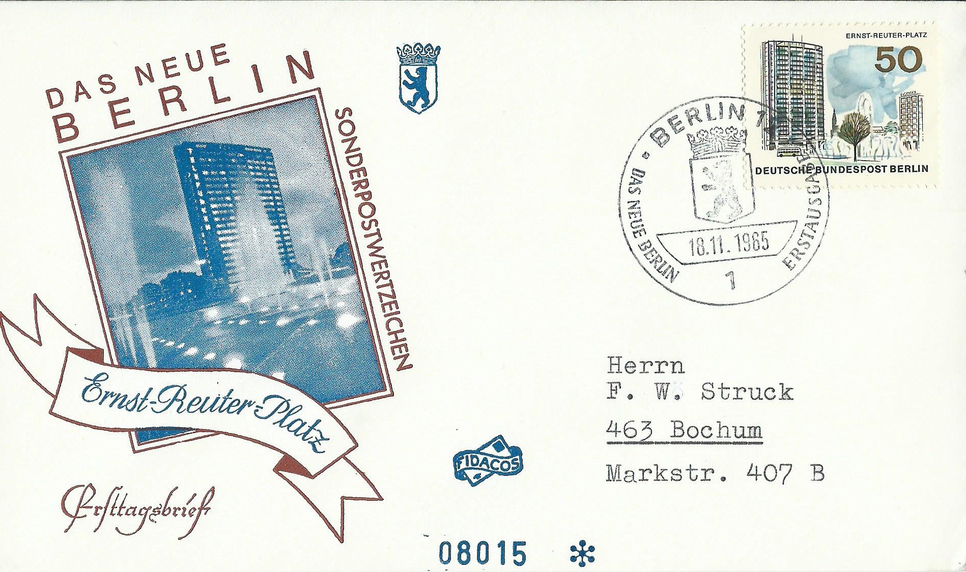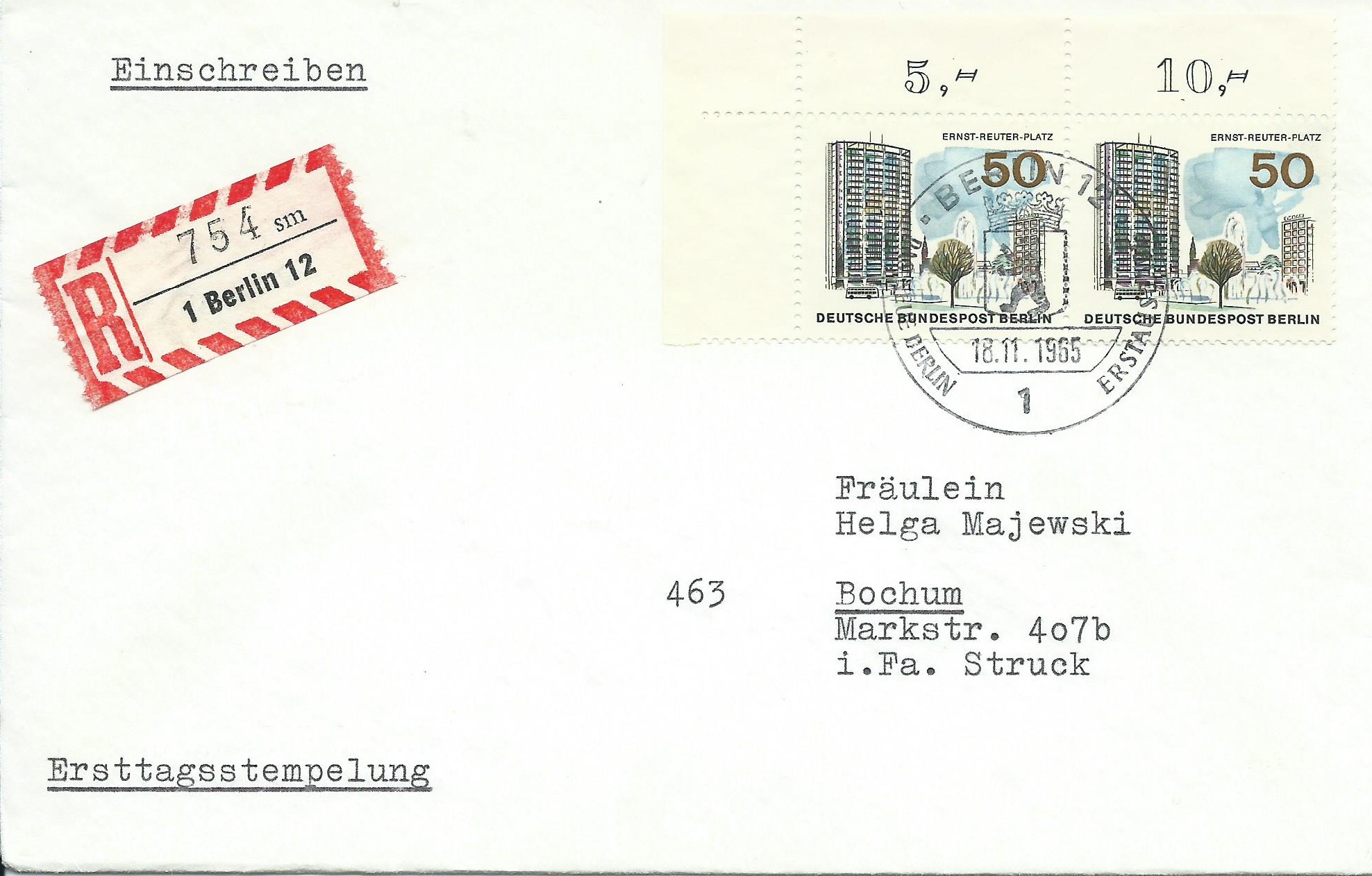 Der Wert zu 50 Pf Ernst-Reuther-Platz klebt auf diesem Beleg 2 Mal als waagerechtes Paar aus der linken oberen Bogenecke und der Brief wurde als Einschreiben befördert. Dieser Beleg wurde mit dem Ersttagssonderstempel Berlin am 18.11.65 gestempelt.