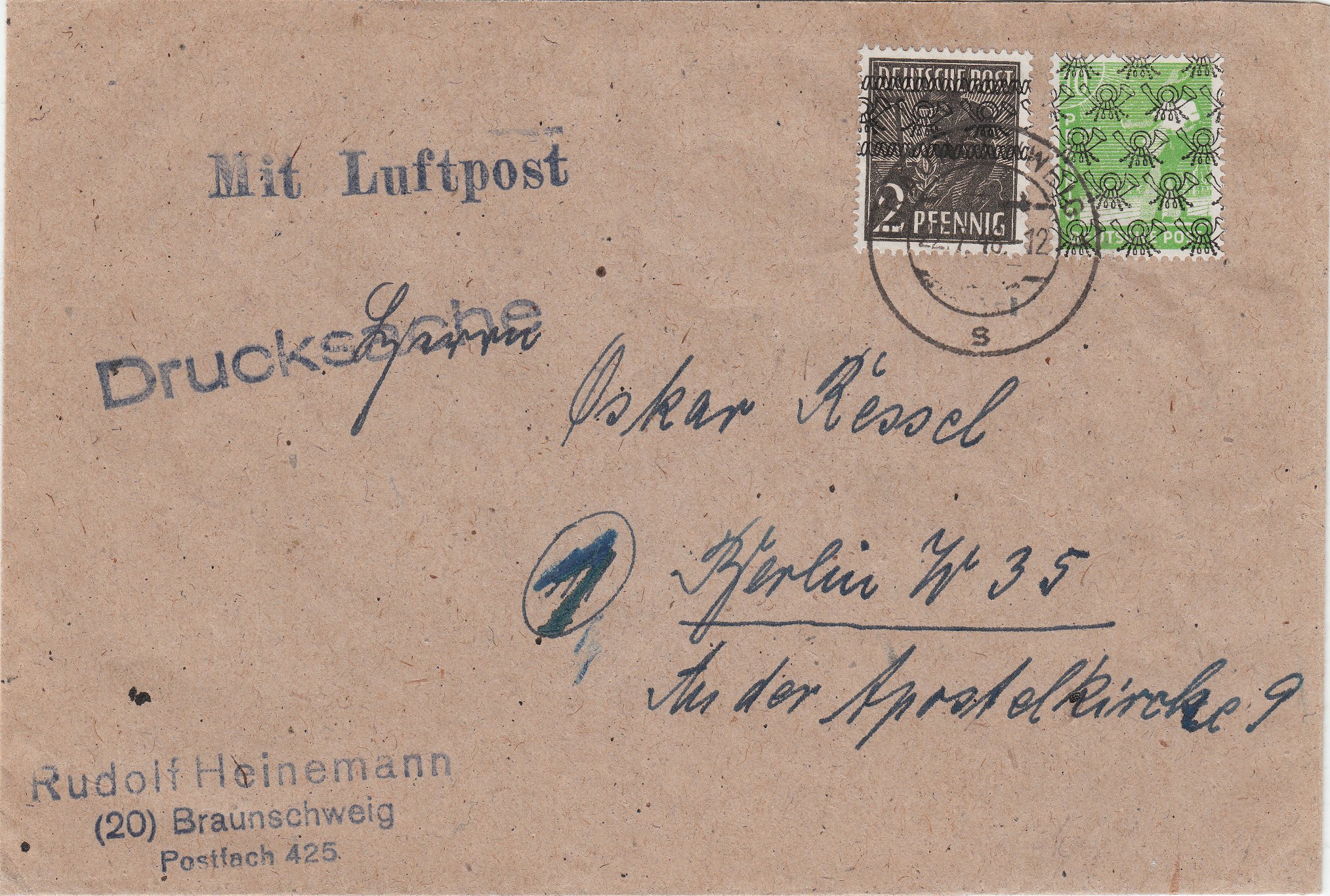 Standardbrief bis 20 g im Fernverkehr, Porto 20 Pf, per Luftpost, Luftpostgebühr 5 Pf, mit 25 Pf demnach portogerecht freigemacht, gelaufen von Recklinghausen nach Berlin, per Luftpost also von Düsseldorf bis Berlin.