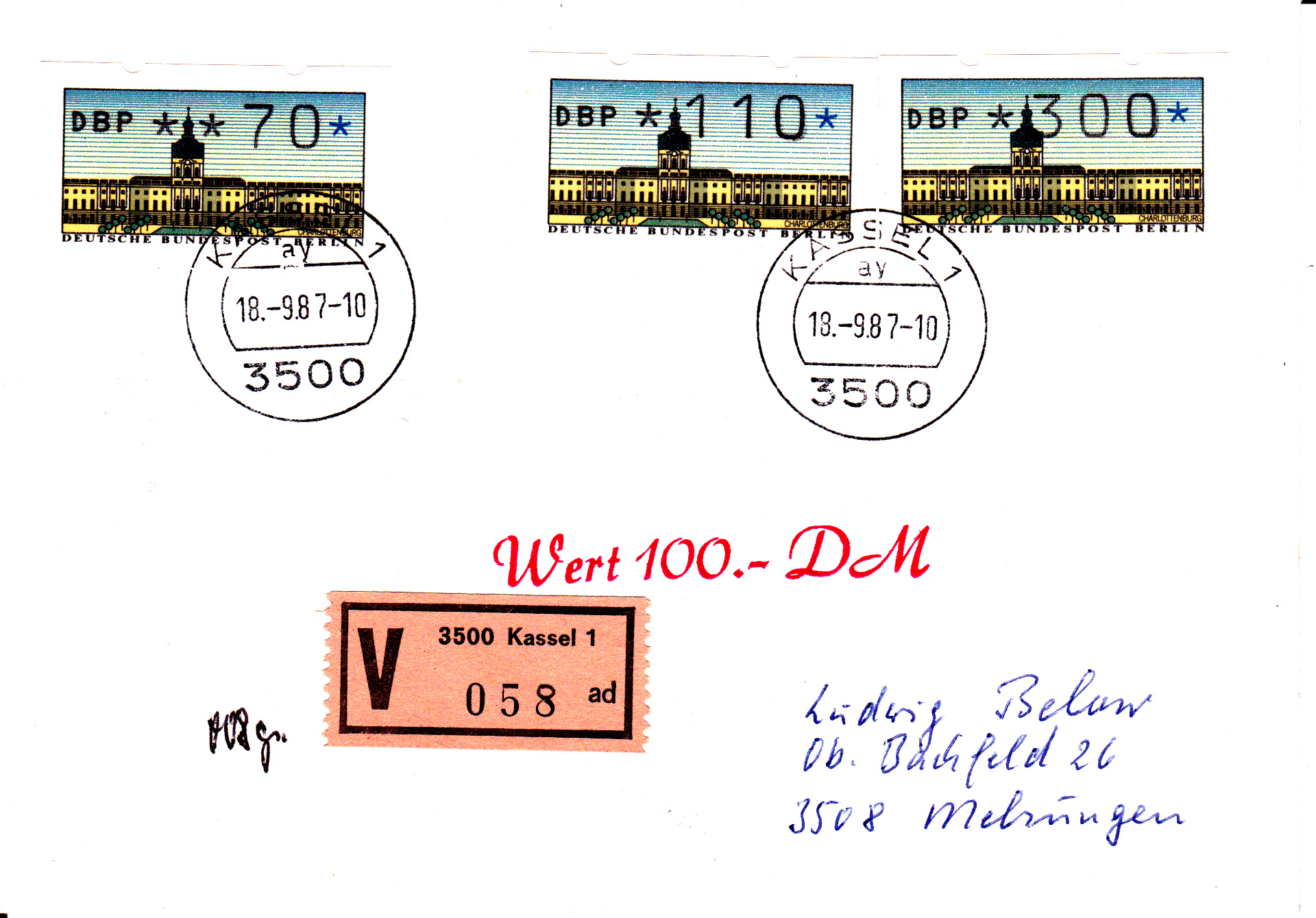 Wertbrief von Kassel nach Melsungen vom 18.9.1987. Das Porto betrug für einen Brief bis 20 g 80 Pf und für einen Wert bis 500 DM 400 Pf, also zusammen 480 Pf. Der Stempel 3500 Kassel 1 mit den Kennbuchstaben "ay" wurde in den Messehallen geführt. Rückseitiger Ankunftsstempel 3508 Melsungen 1 vom 19.8.1987.