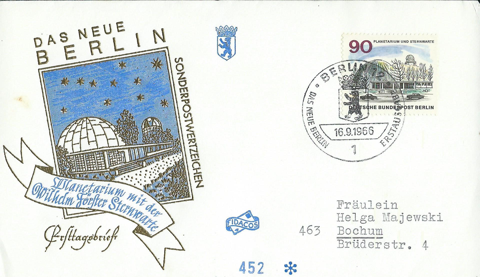 Der Wert zu 90 Pf Planetarium als Einzelfrankatur. Dieser Beleg wurde mit dem Ersttagssonderstempel Berlin am 16.9.66 gestempelt.