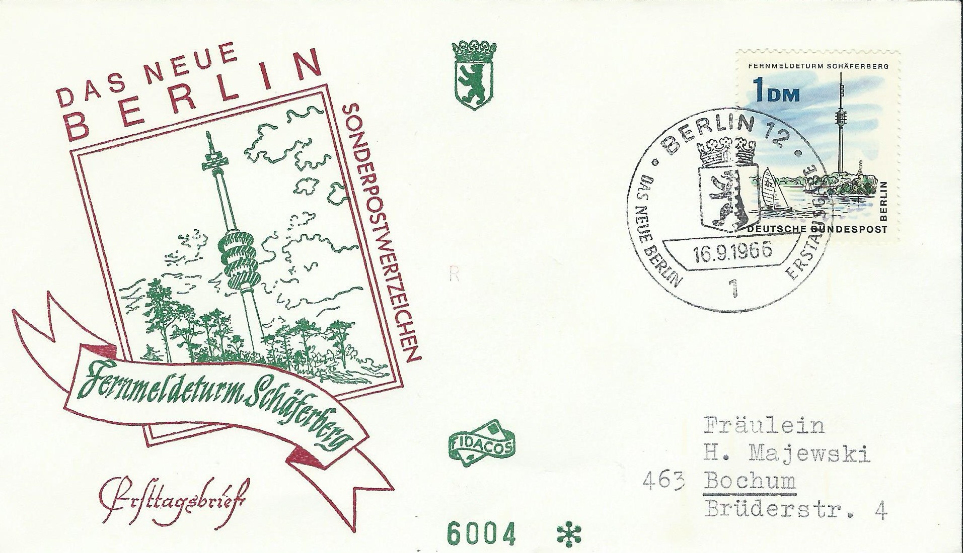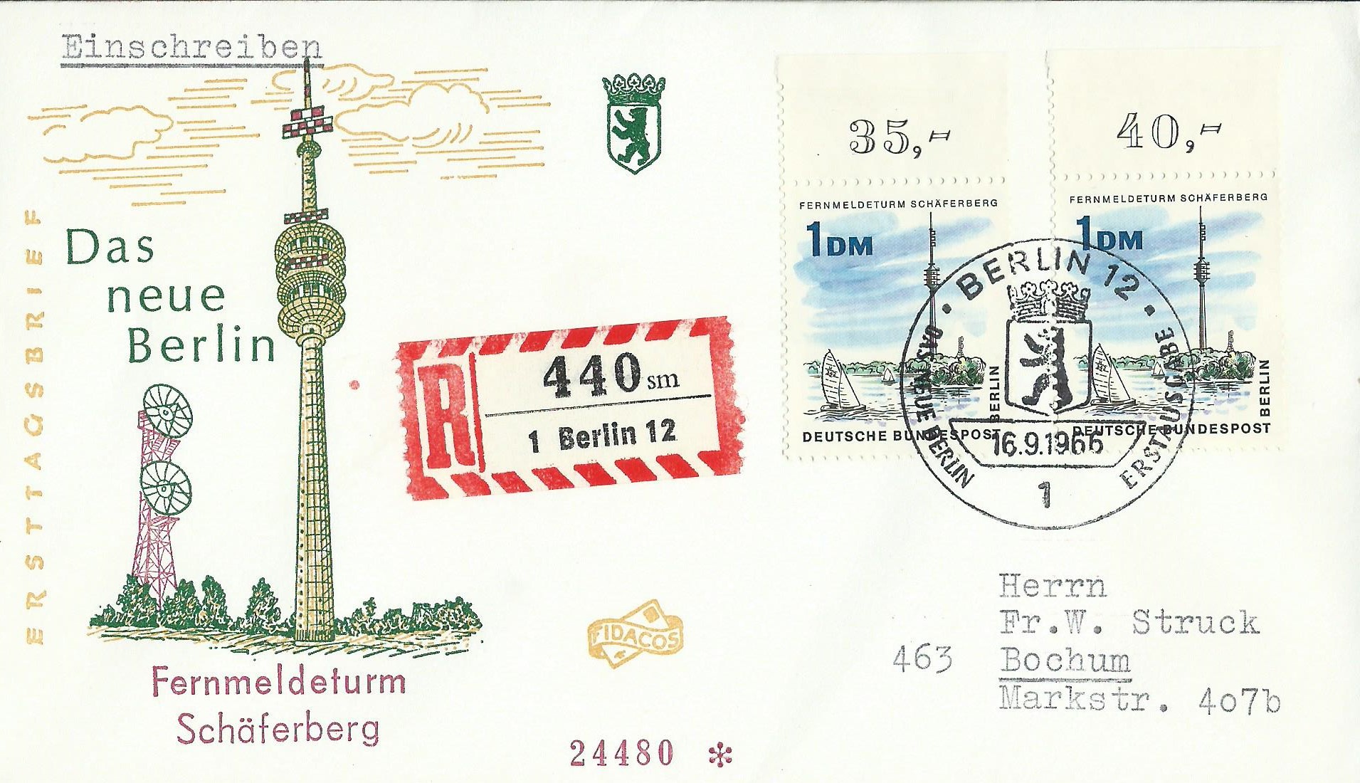 Der Wert zu 1 DM Fernmeldeturm Schäferberg als Einzelfrankatur. Dieser Beleg wurde mit dem Ersttagssonderstempel Berlin am 16.9.66 gestempelt.