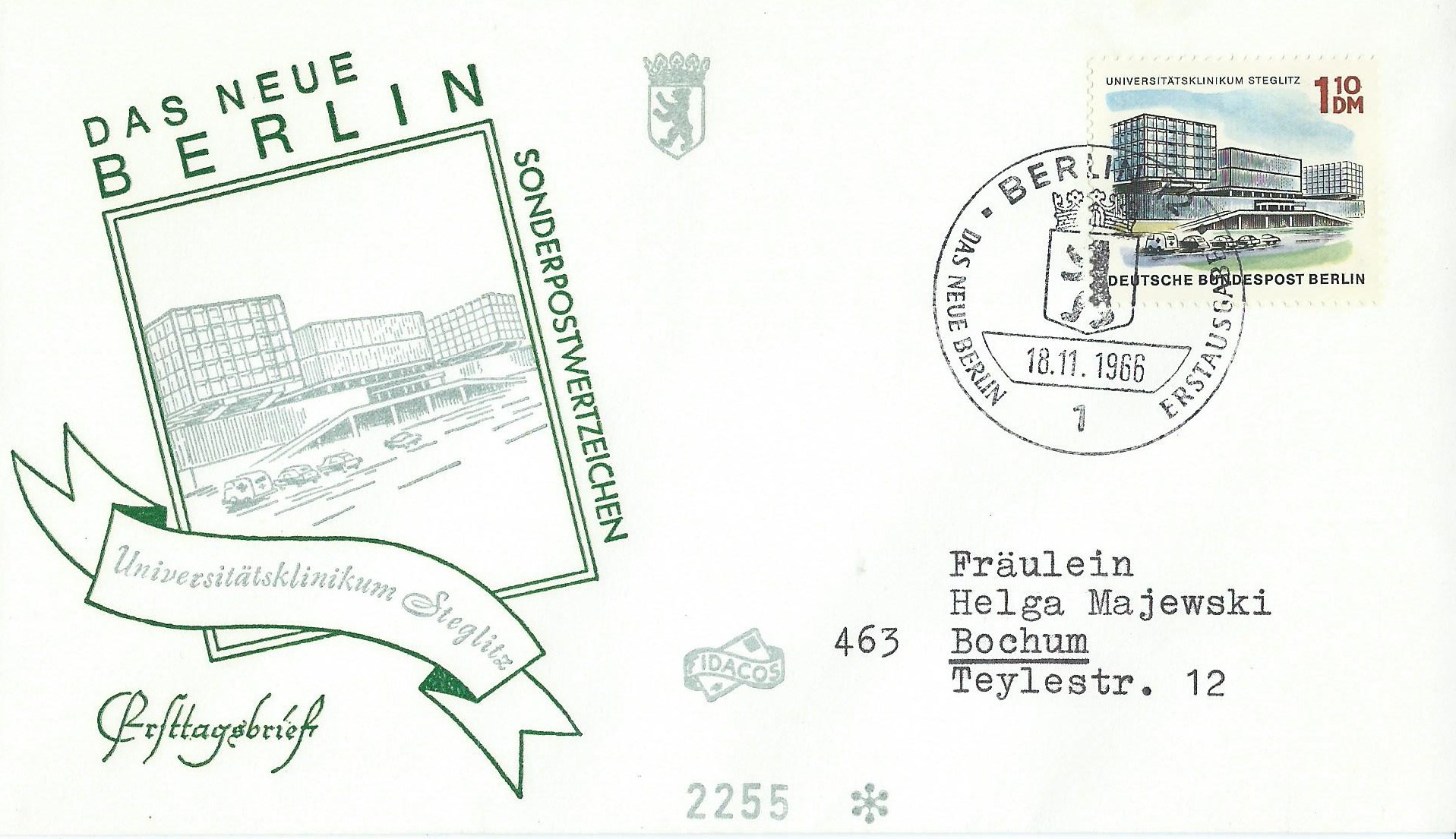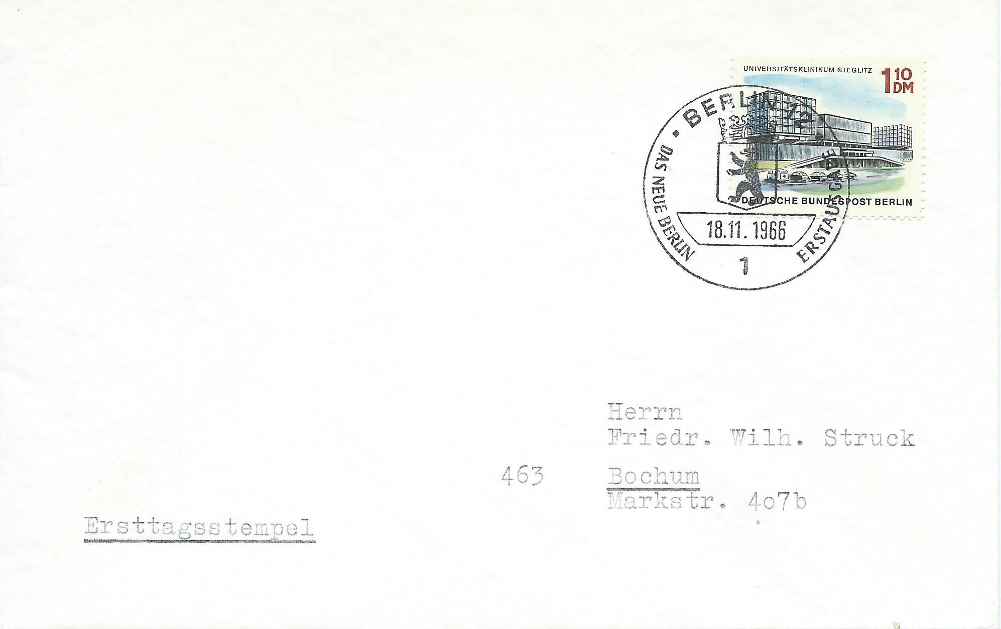 Der Wert zu 1,10 DM Universitätsklinikum Steglitz als Einzelfrankatur. Dieser Beleg wurde mit dem Ersttagssonderstempel Berlin am 18.11.66 gestempelt.