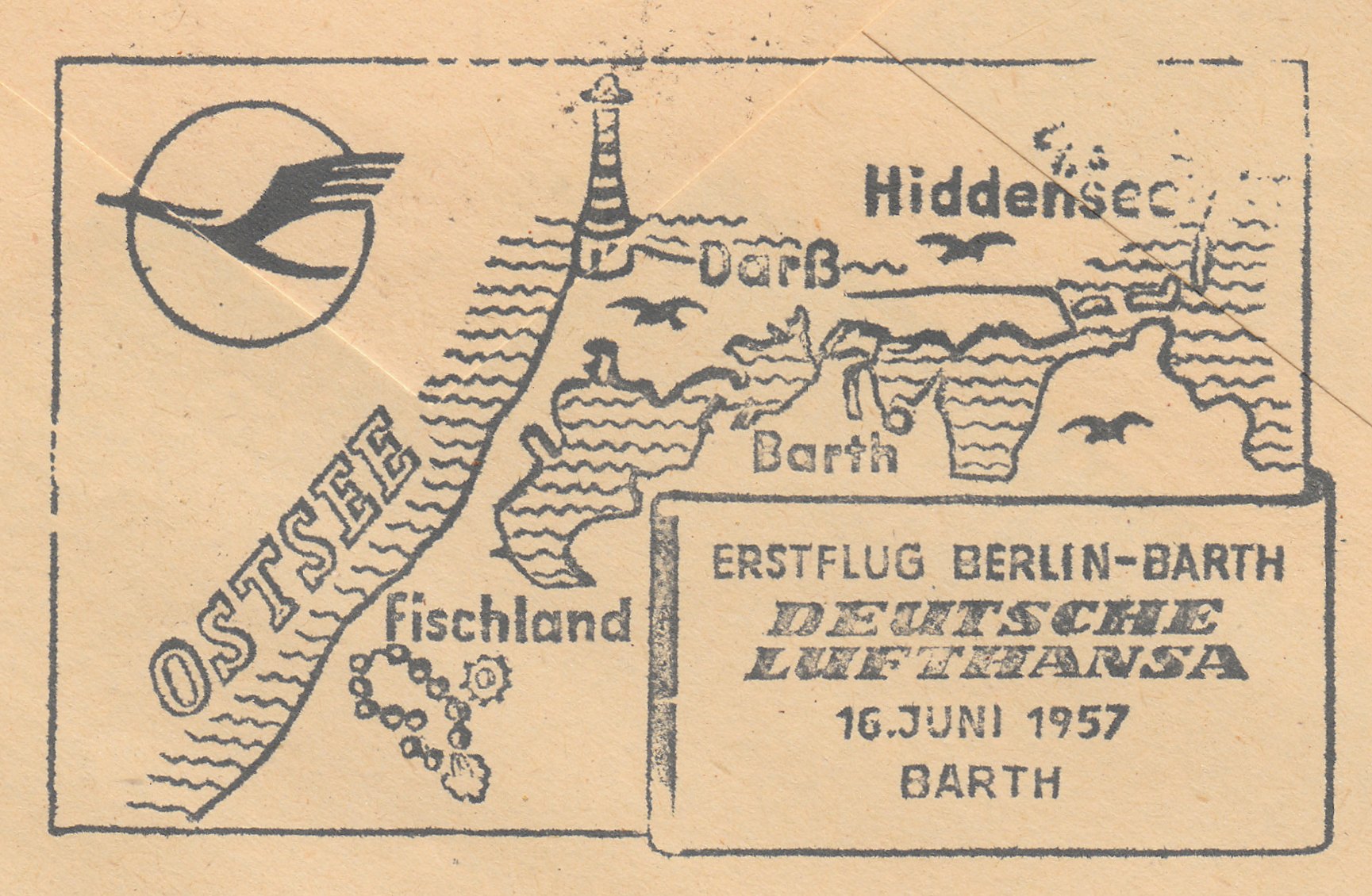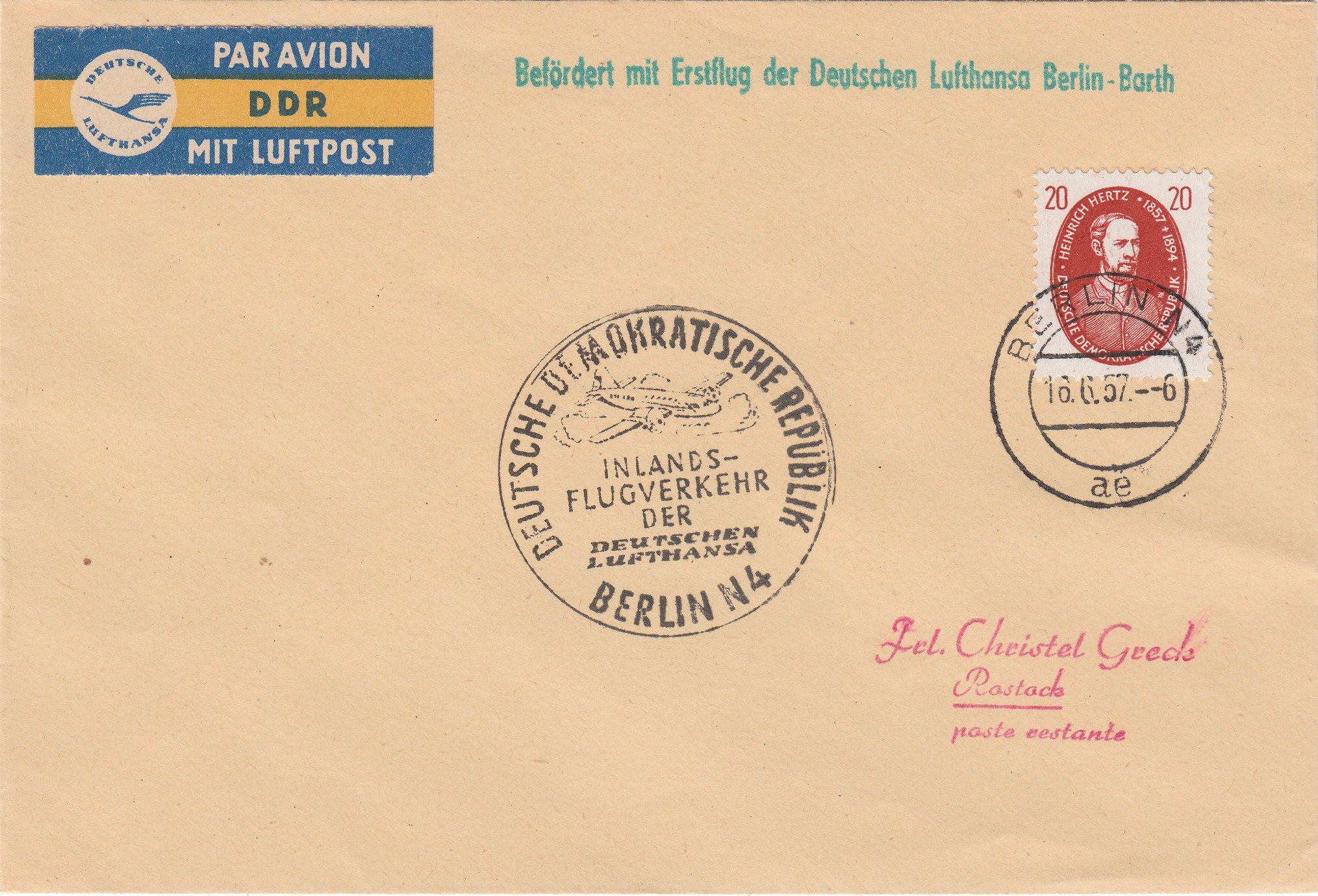 Standardbrief bis 20 g im Fernverkehr, Porto 20 Pf, in der DDR im Inland ohne Luftpostgebühr, mit 20 Pf demnach portogerecht freigemacht, gelaufen per Luftpost von Berlin nach Barth mit dem Erstflug der Lufthansa.