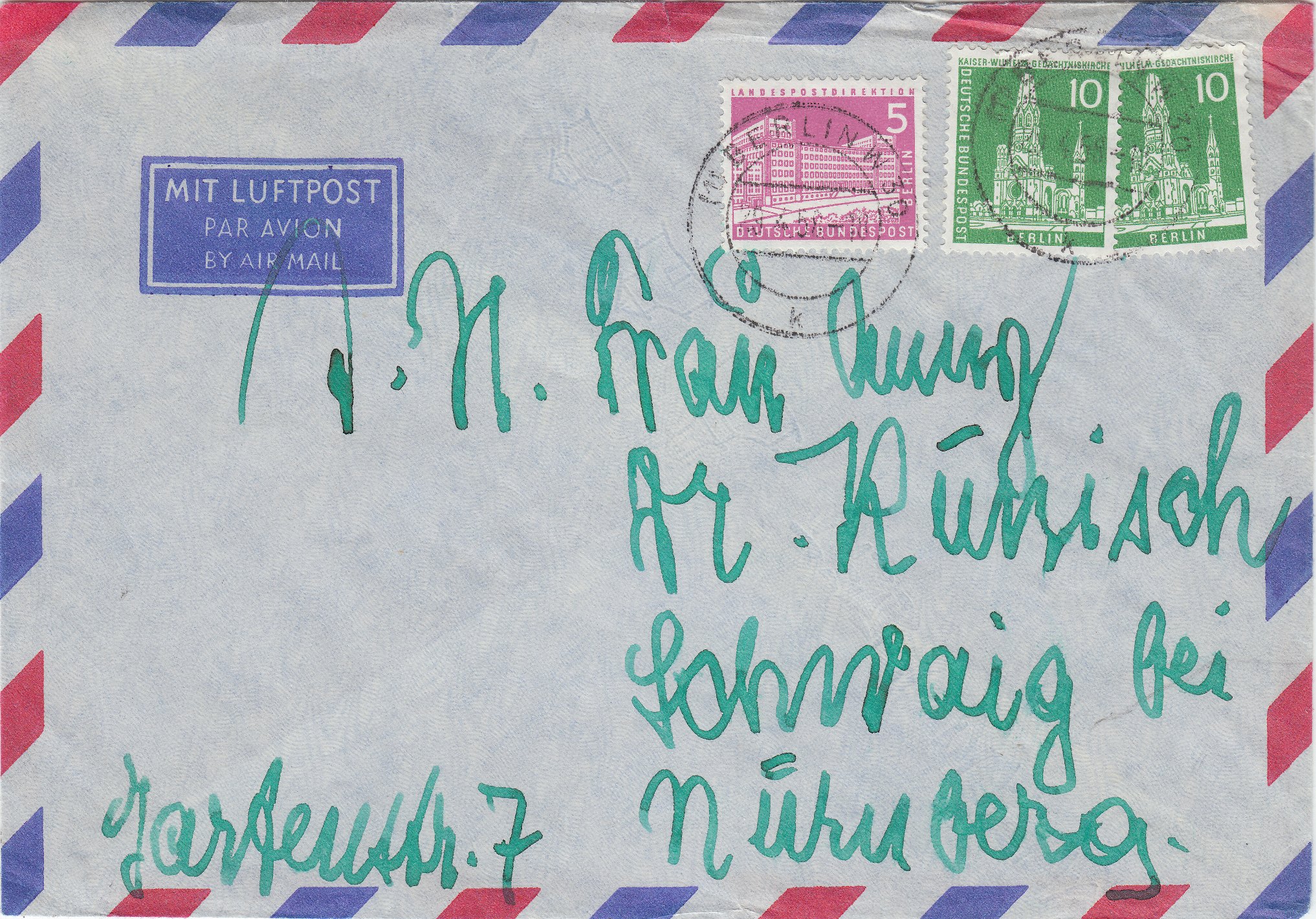 Brief im Fernverkehr ab Berlin, adressiert nach Schwaig bei Nürnberg, Porto 20 Pf, per Luftpost, Luftpostgebühr 5 Pf: