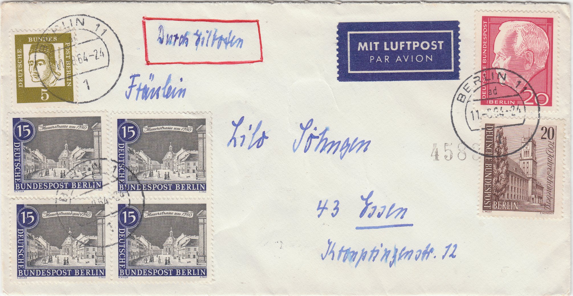 Brief im Fernverkehr ab Berlin 11, am 11.08.1964 um 24 Uhr aufgegeben, adressiert nach Essen, Porto 20 Pf, per Luftpost, Luftpostgebühr 5 Pf, per Eilzustellung, Porto 80 Pf: