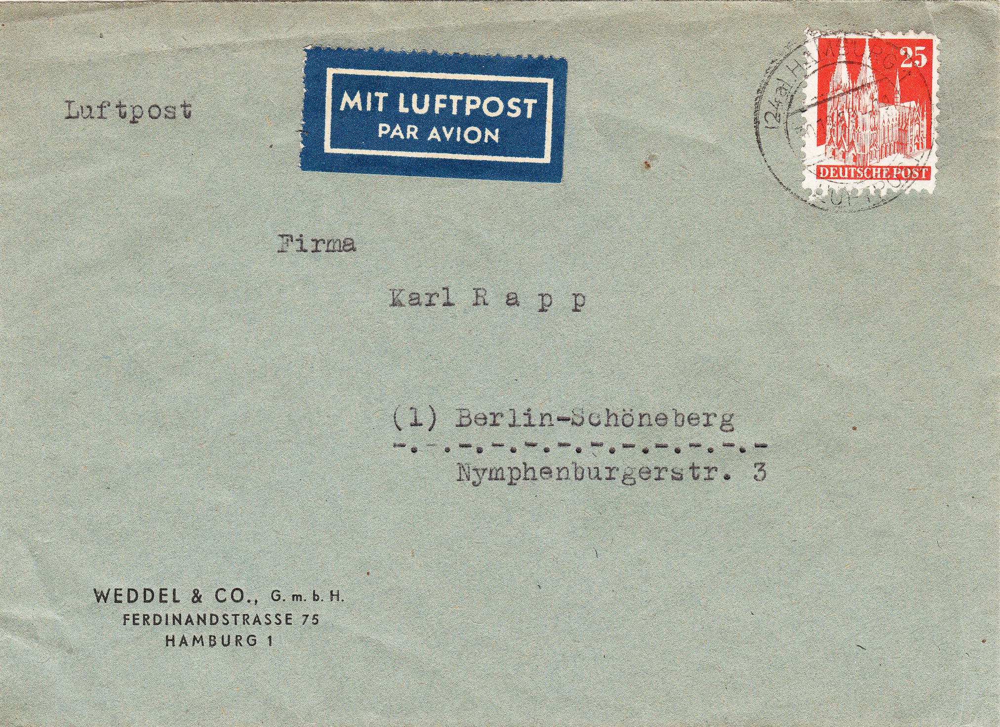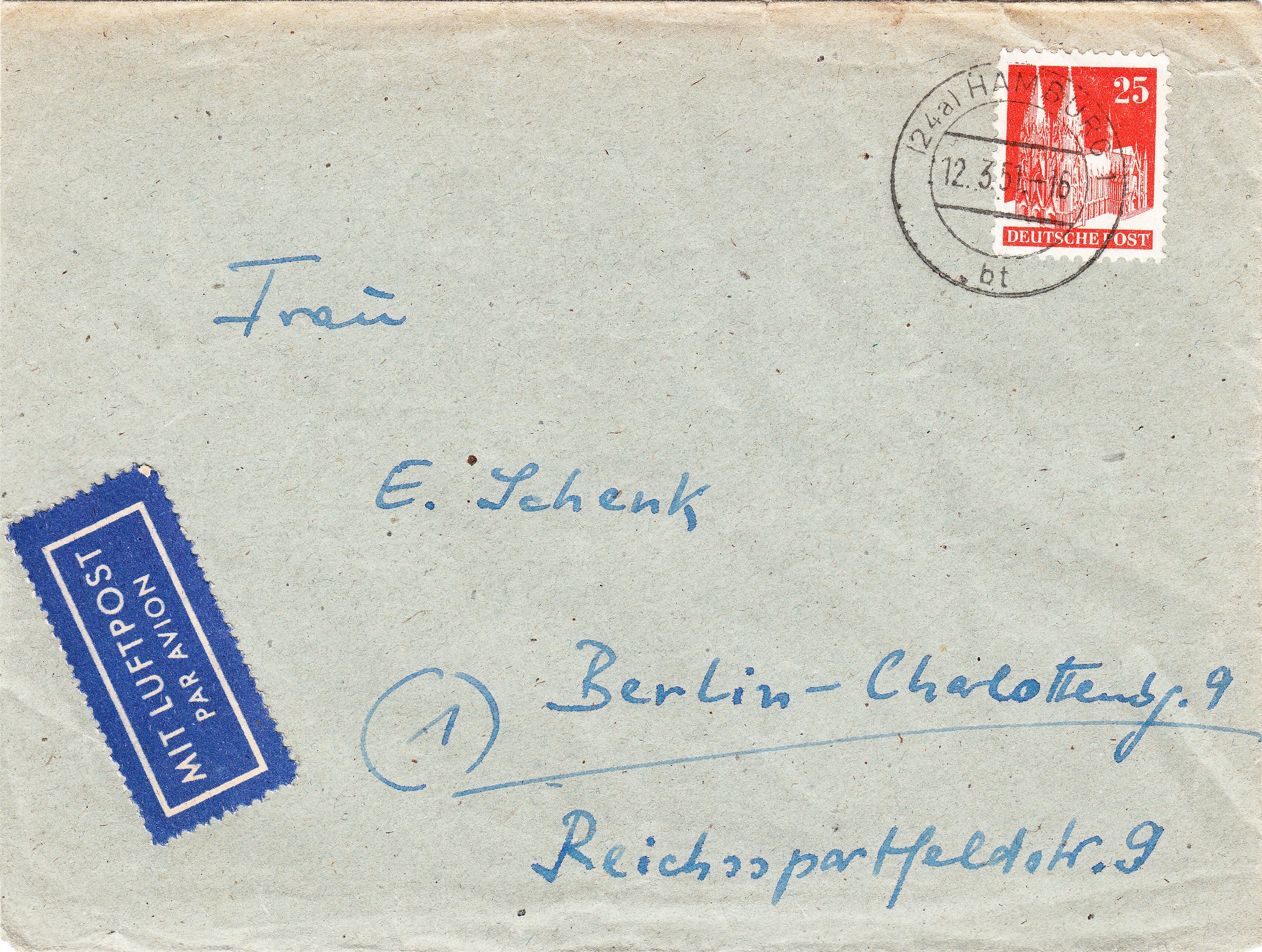 Dieser Beleg wurde am 12.03.1951 in Hamburg aufgegeben und lief per Inlandsluftpost nach Berlin: