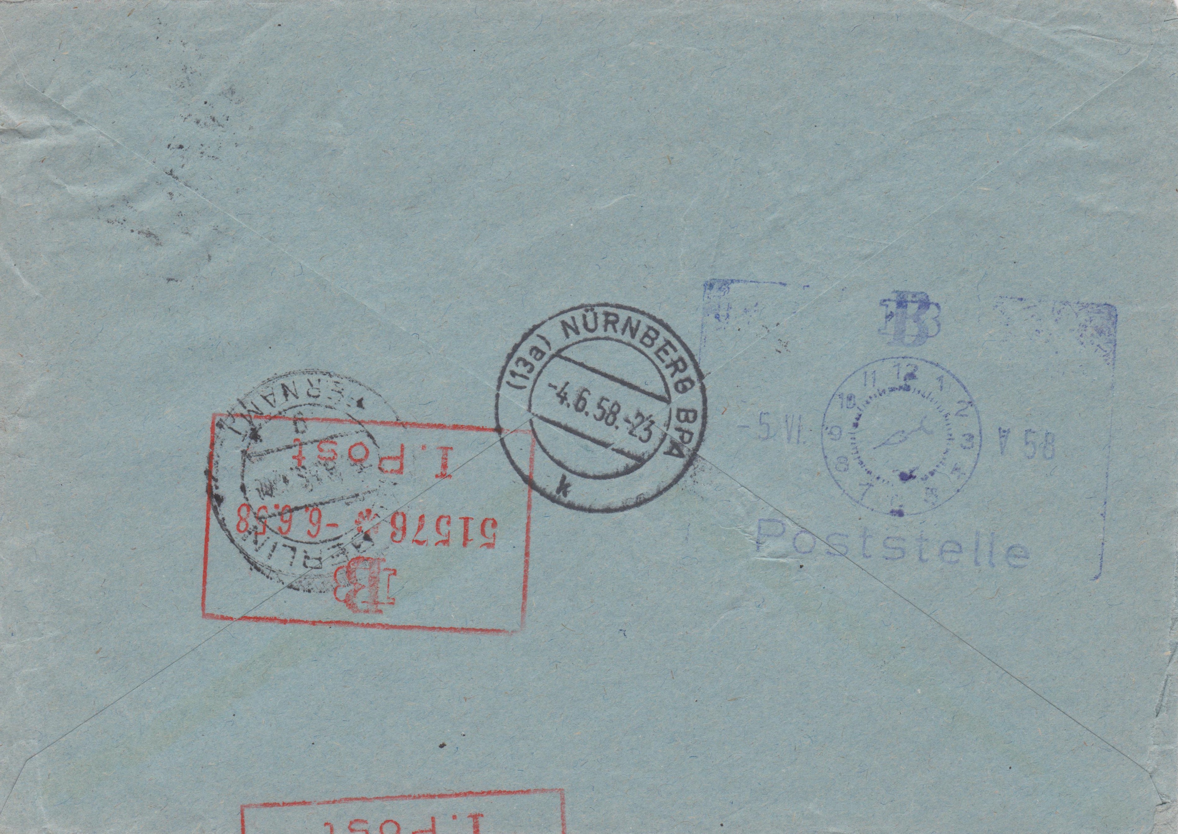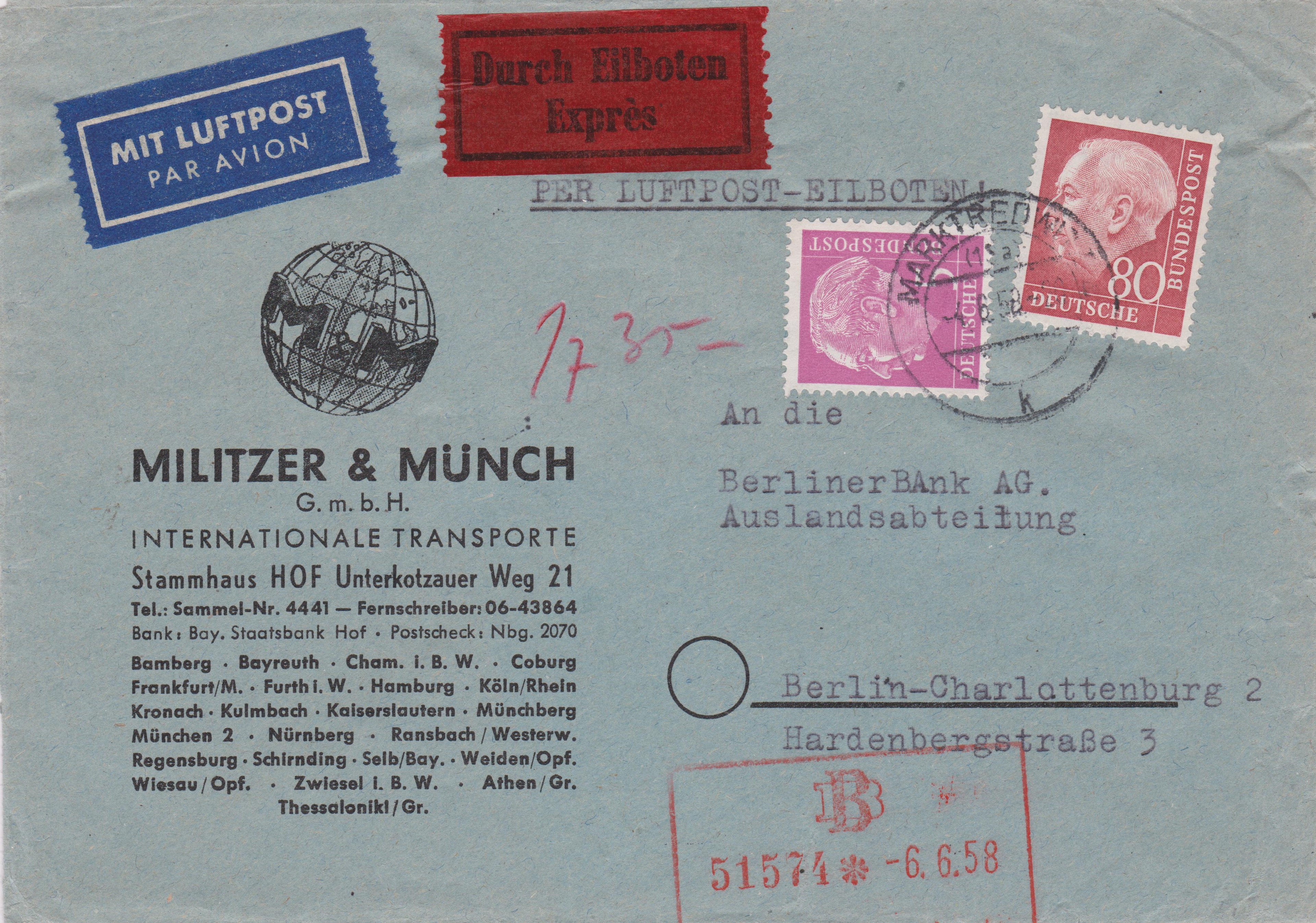 Brief (20 Pf) per Eilboten (60 Pf) und per Inlandsluftpost (5 Pf) ergibt die Portostufe 85 Pfennig, aufgegeben am 04.06.1958 um 20 Uhr in MARKREDWITZ :