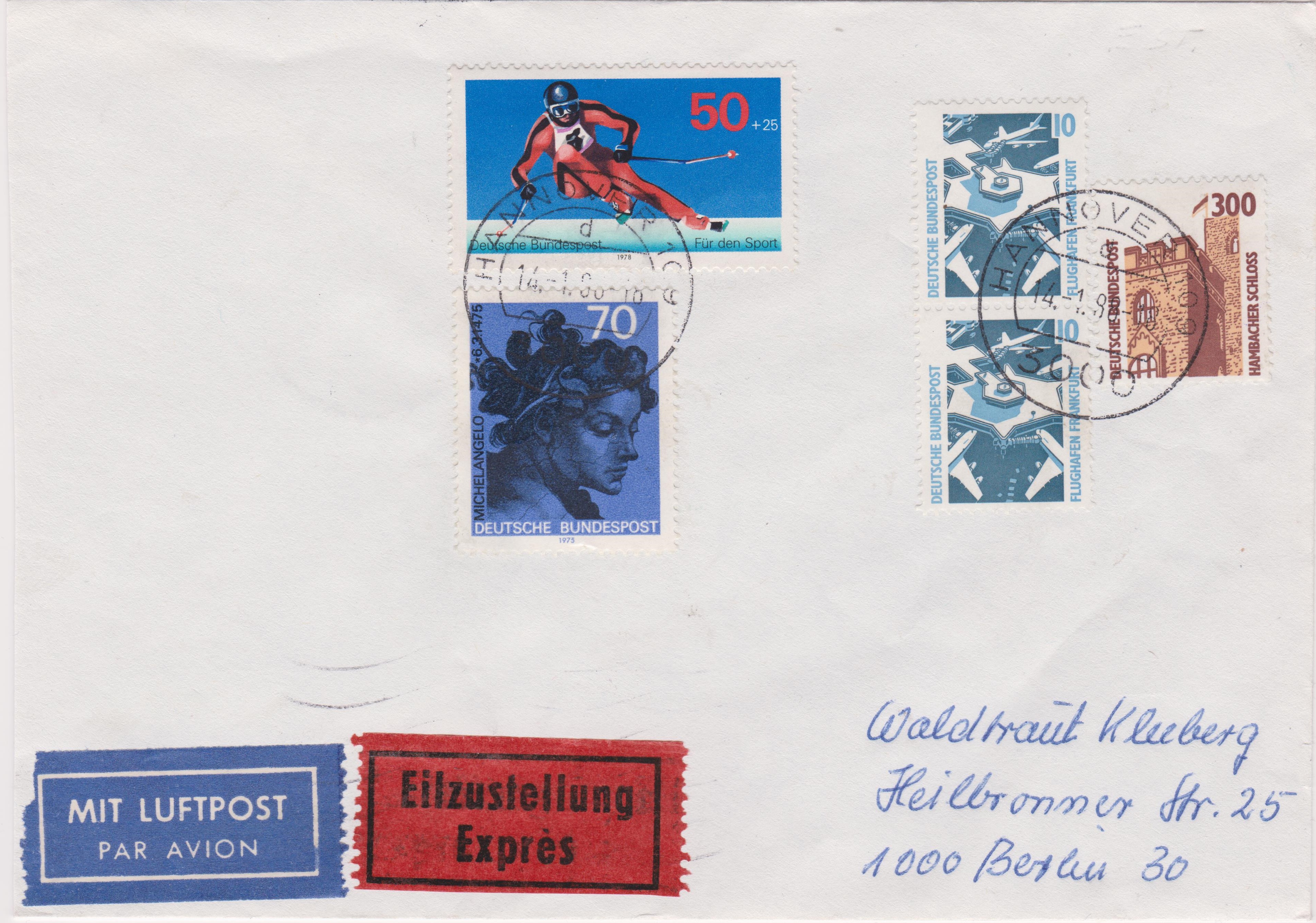 Per Inlandsluftpost am 14.01.1988 von Hannover nach Berlin echt gelaufener Ersttagsbrief der Wertstufen 300 Pf sowie 10 Pf der Dauerserie SWK: