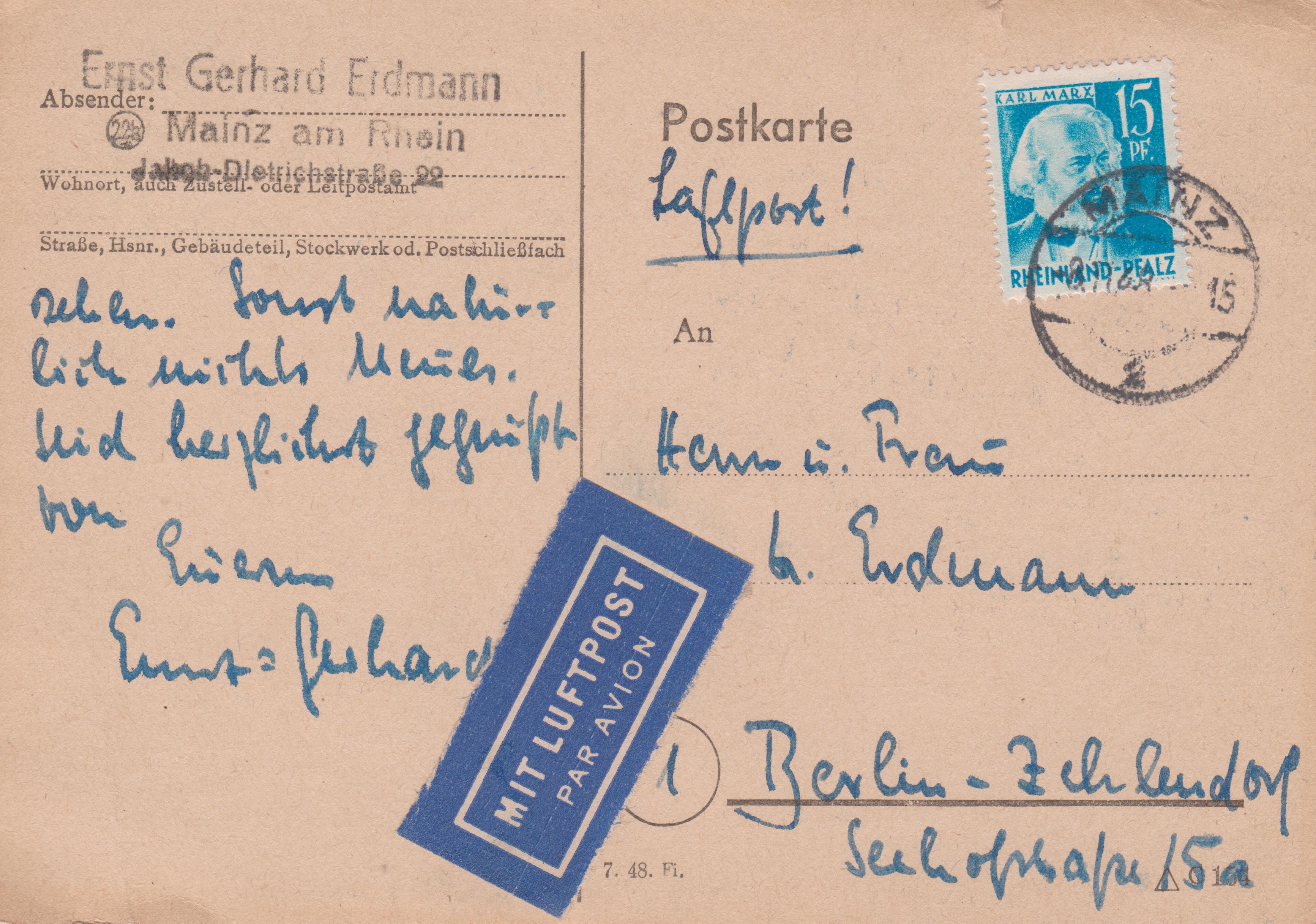 Postkarte im Fernverkehr von Mainz nach Berlin, Porto 10 Pf, per Inlandsluftpost nach Berlin, Porto 5 Pf, ergibt die Portostufe 15 Pf, hier dargestellt per Einzelfrankatur Alliierte Besetzung (Französische Zone - Rheinland-Pfalz) MiNr. 21.