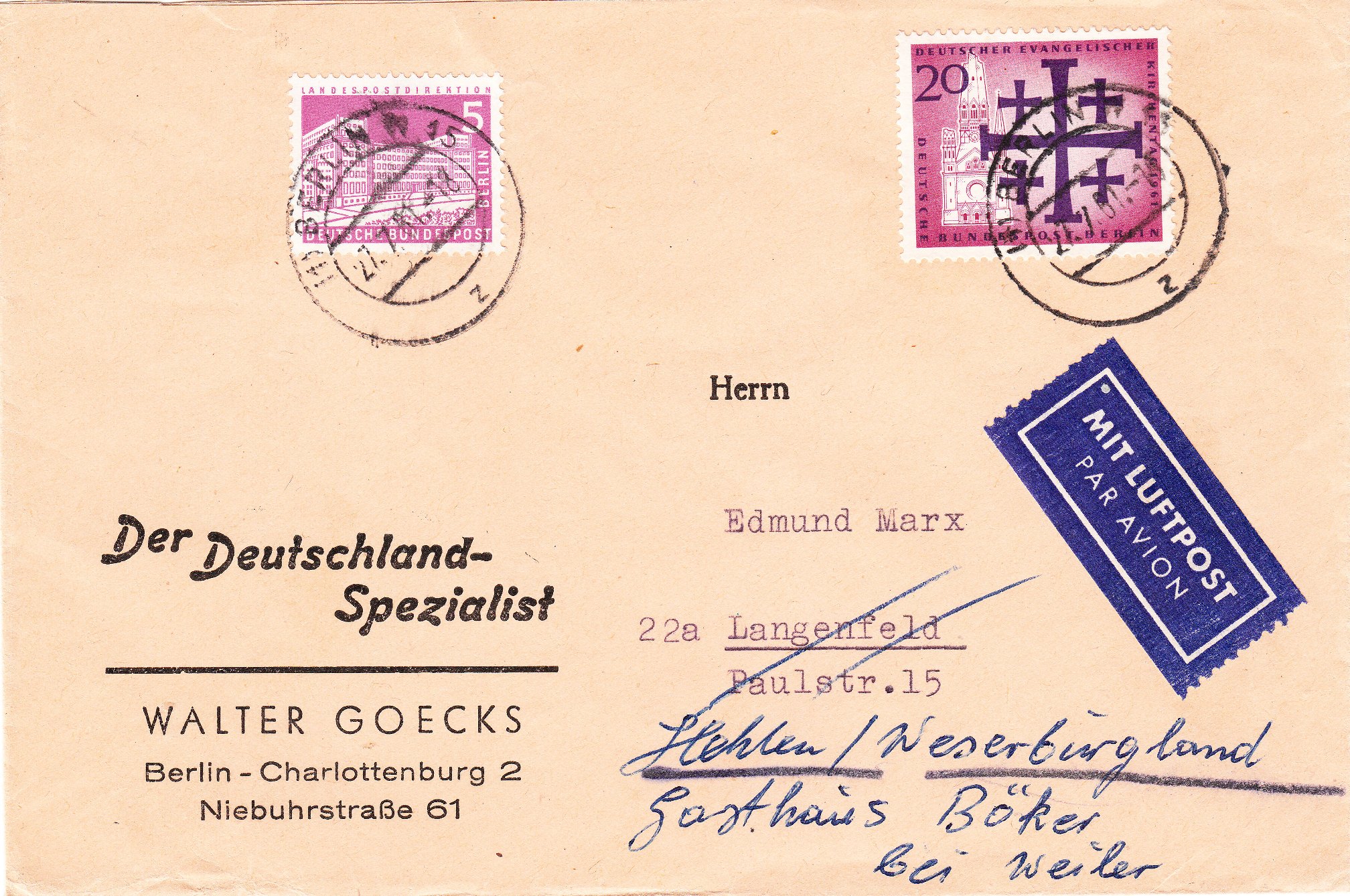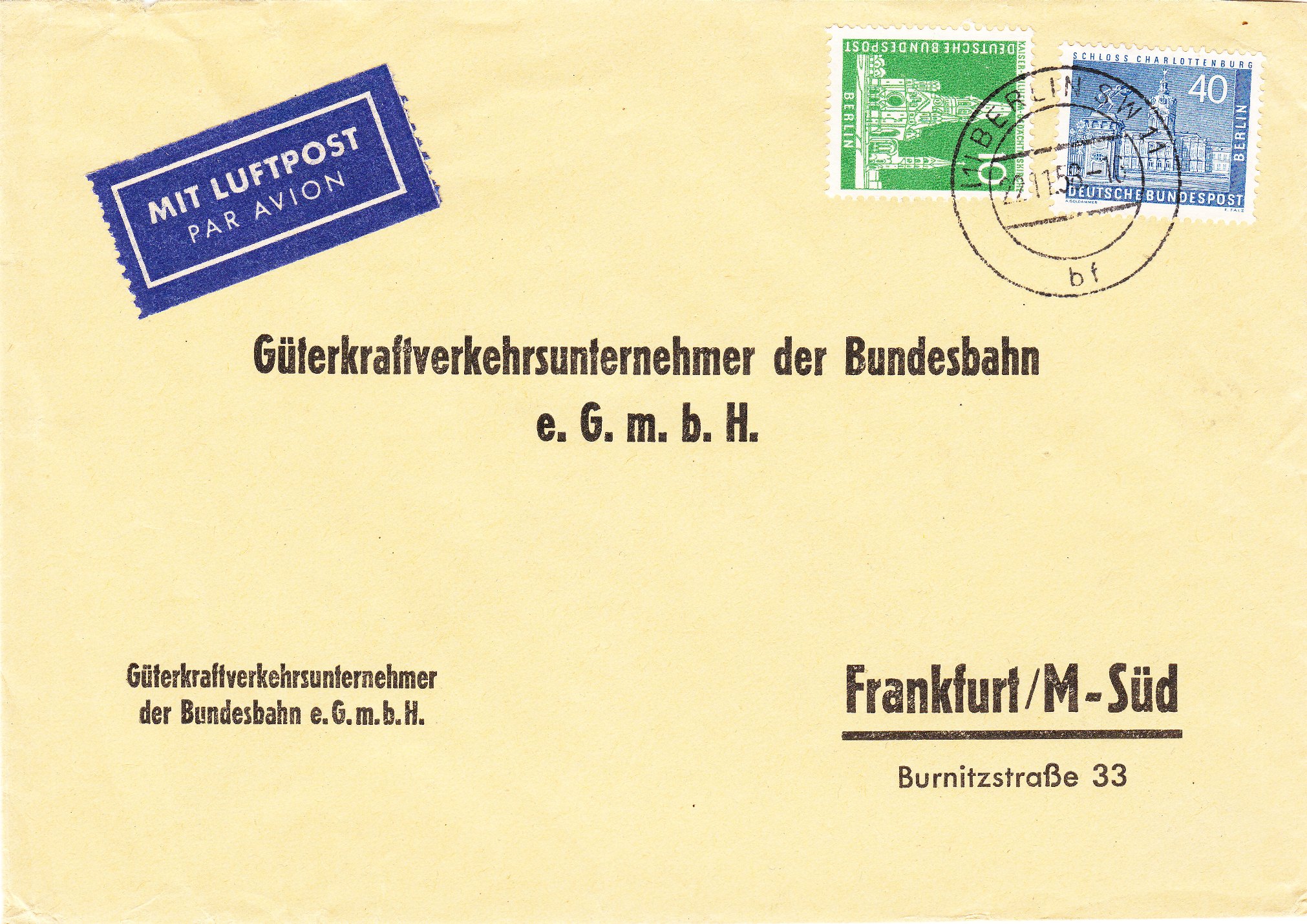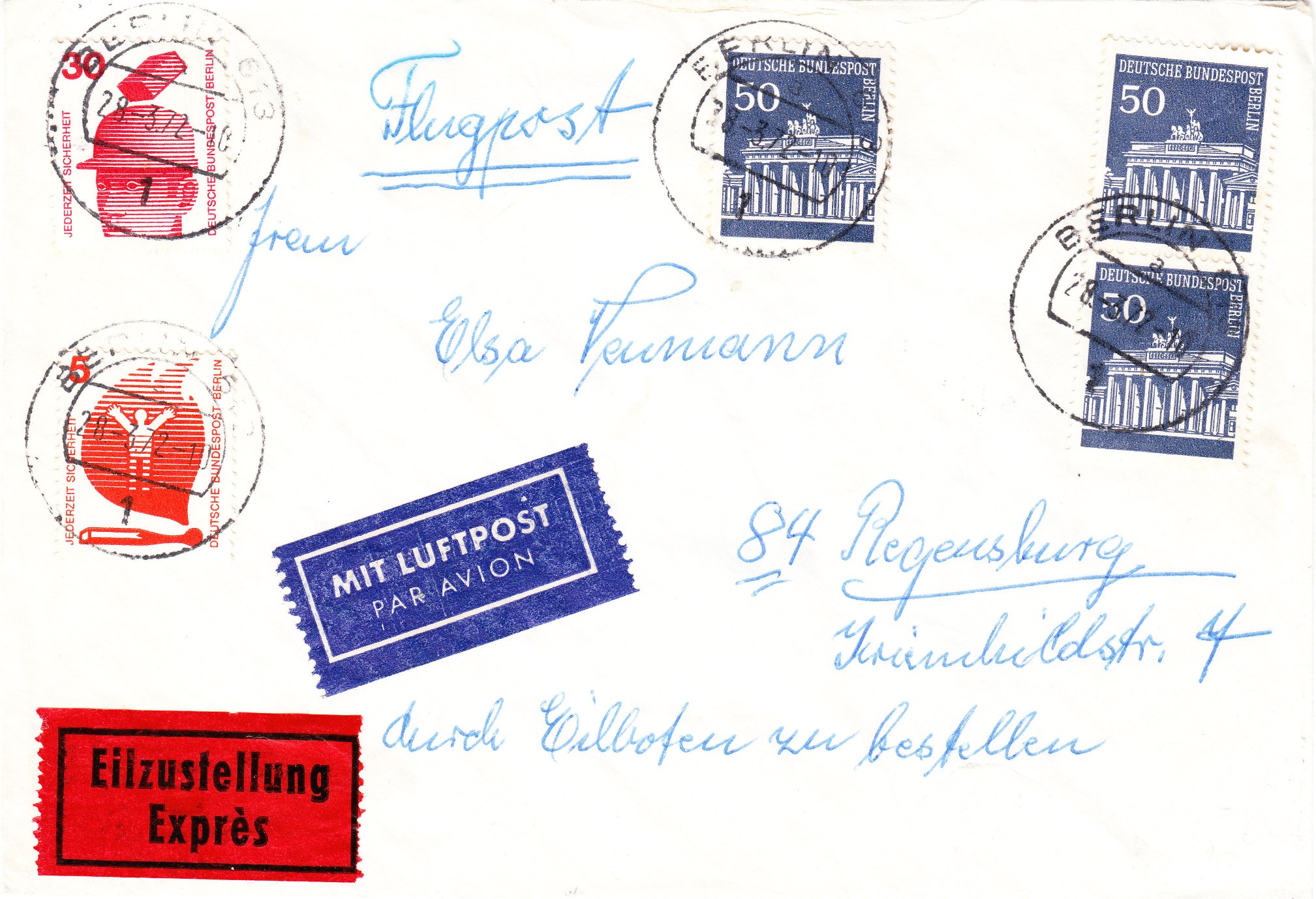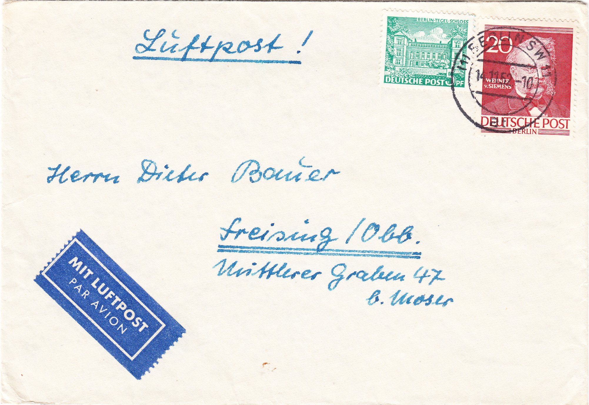 Dieser nach Ansbach in Mittelfranken adressierte, am 17.11.1950 in BERLIN-WILMERSDORF aufgegebene Brief wurde per Inlandsluftpost von Berlin nach Nürnberg befördert: