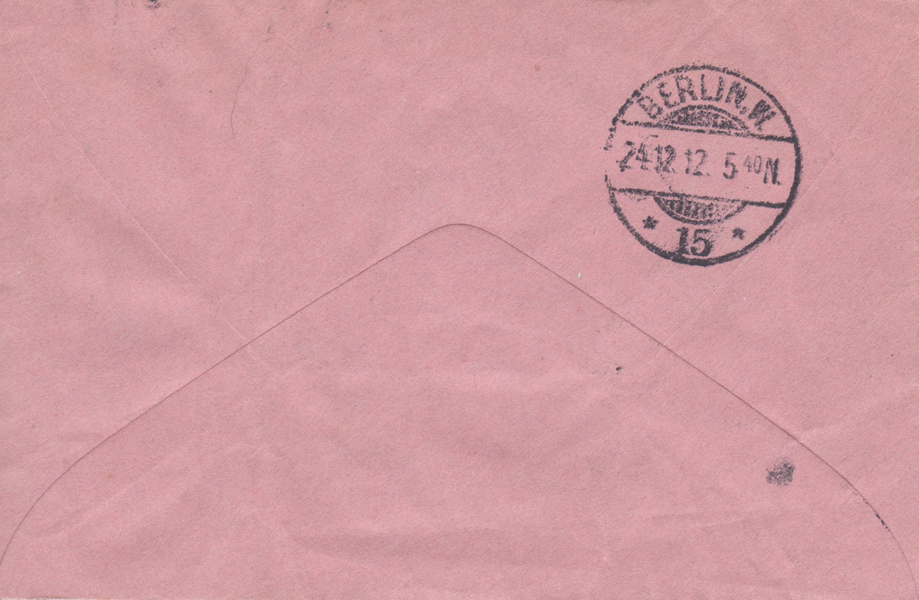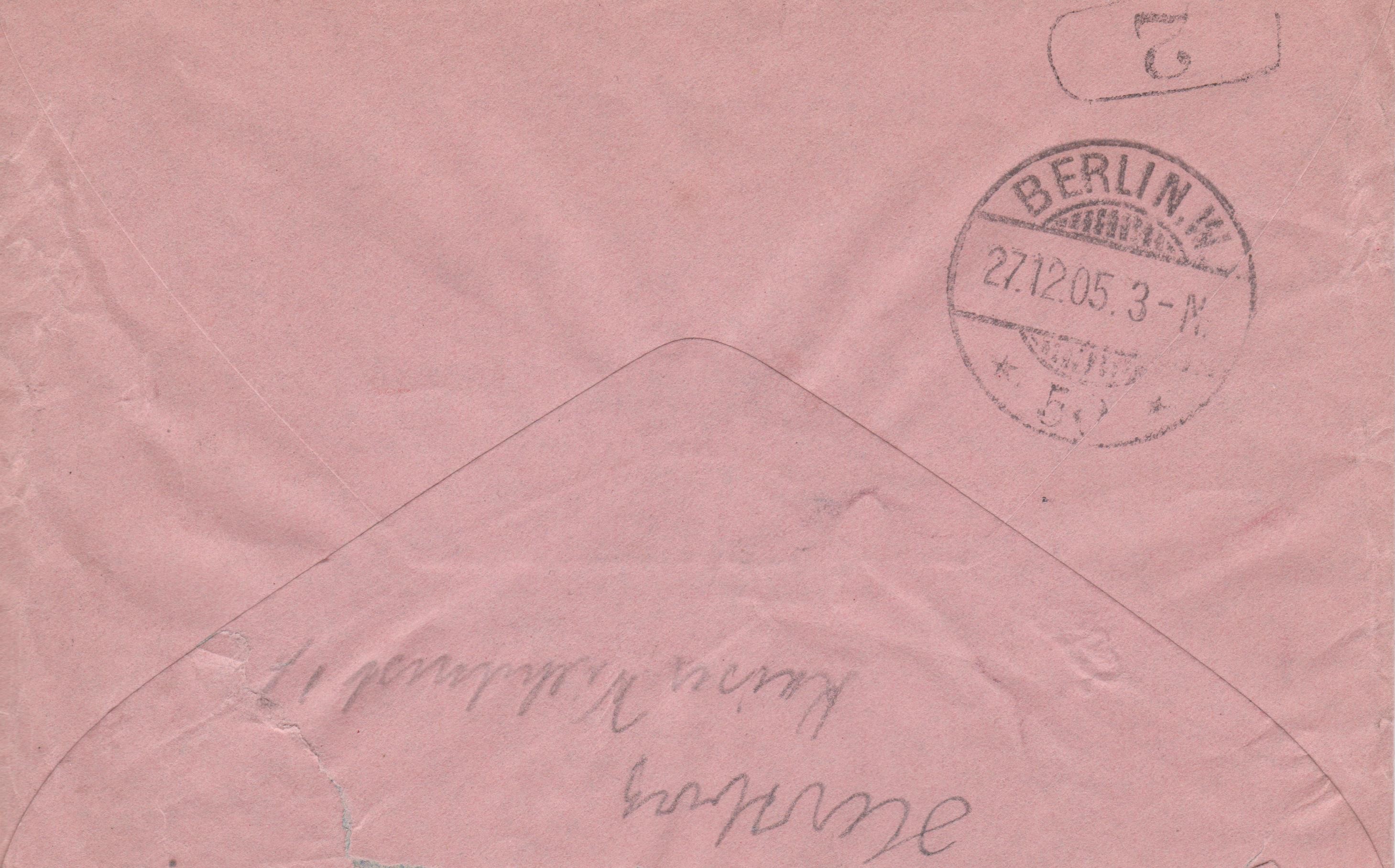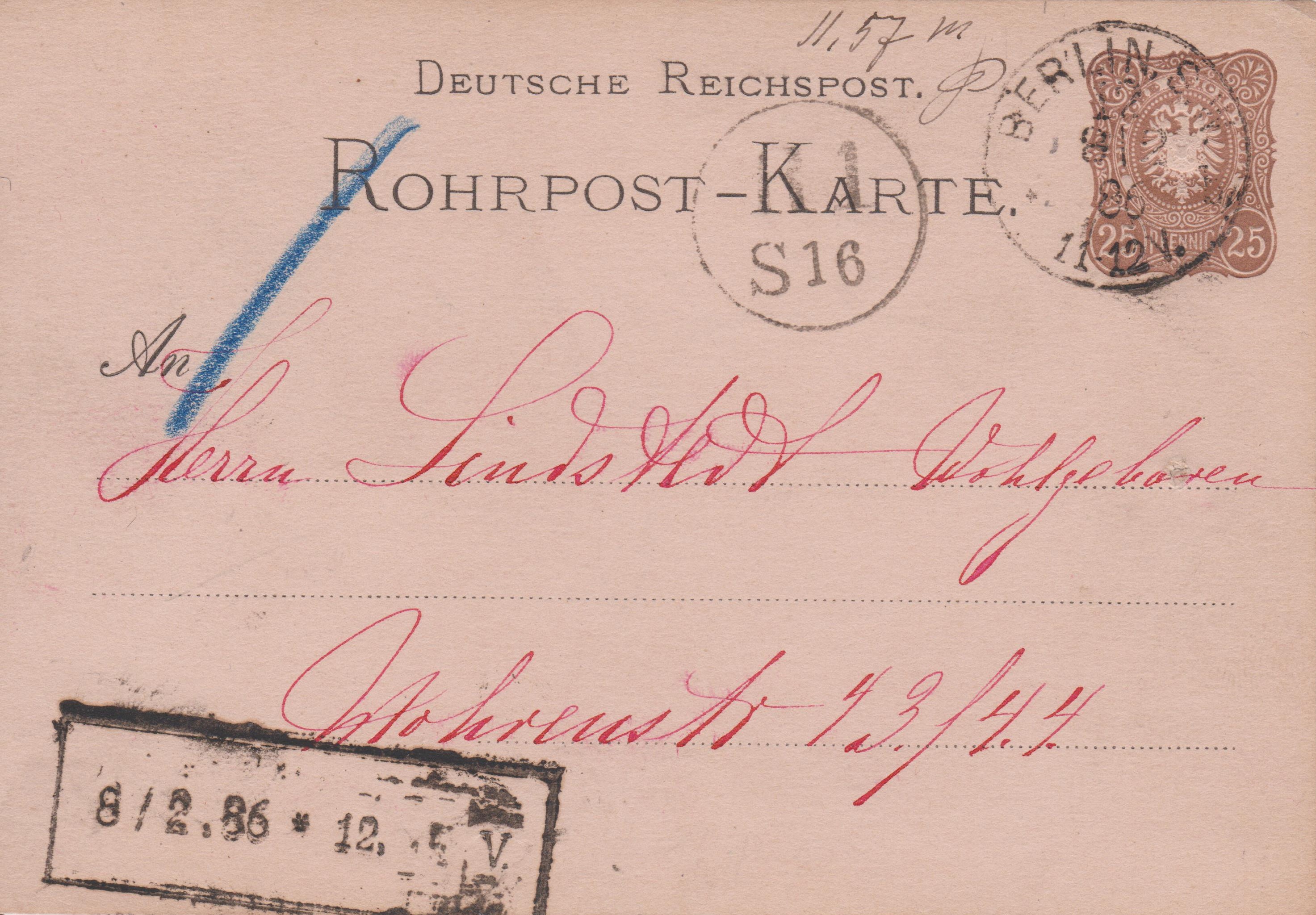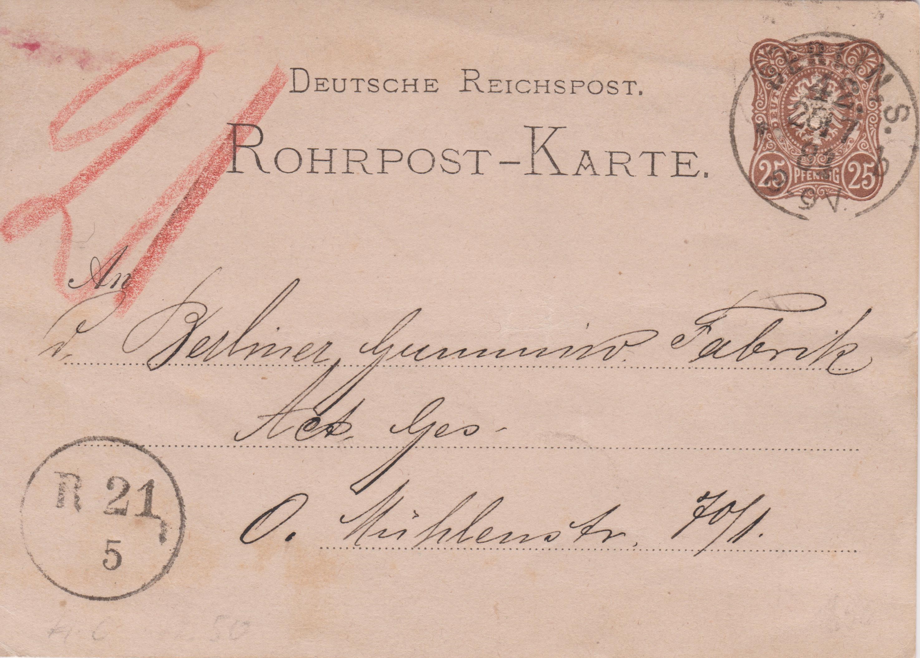 Ganzsache Deutsches Reich "Rohrpost-Brief", MiNr. RU 6, aufgegeben am 24.12.1912 um "4 50 N." in "BERLIN, W. 64", per Rohrpost befördert nach "15", rückseitig Ankunftstempel der Rohrpost "BERLIN, W. 15 24.12.12 5 40N.":