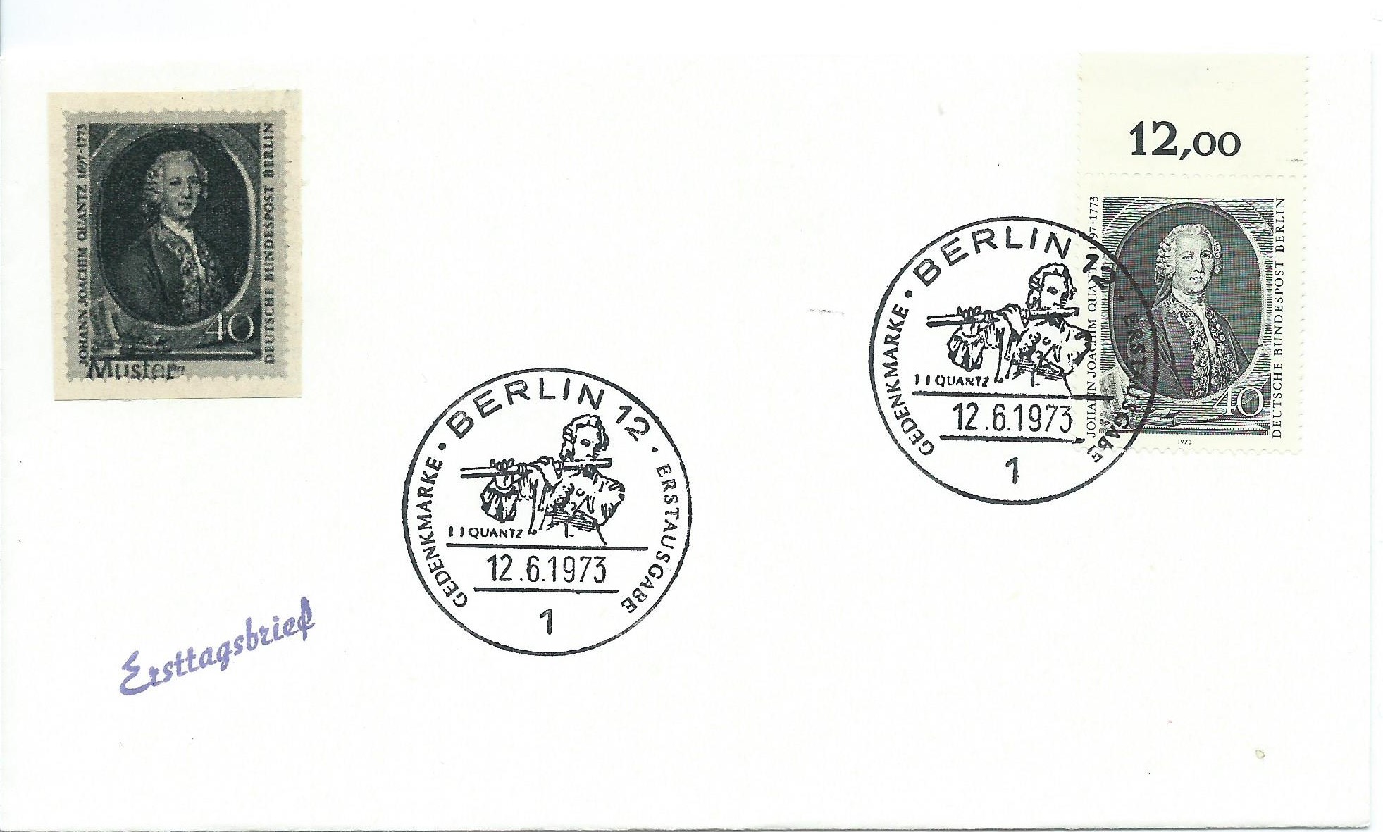Ein weiteres Oberrandstück mit Reihenwertzähler, hier die Michel-Nummer 454 200. Geburtstag von Johann Joachim Quantz. Auf diesen Beleg wurde auch wieder ein Bild aus einer Zeitung mit dem Abdruck einer Muster-Marke geklebt. Gestempelt wurde mit dem Ersttagssonderstempel Berlin vom 12.6.73.