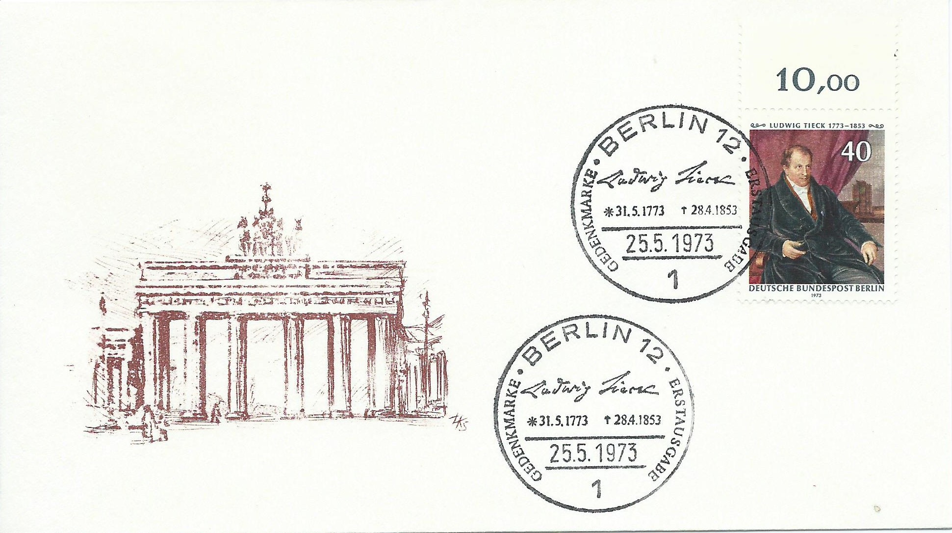 Ein Oberrandstück mit Reihenwertzähler von der Michel-Nummer 452 200. Geburtstag von Ludwig Tieck auf einem Schmuck-Ersttagsbrief. Gestempelt wurde mit dem Ersttagssonderstempel Berlin vom 25.5.73.