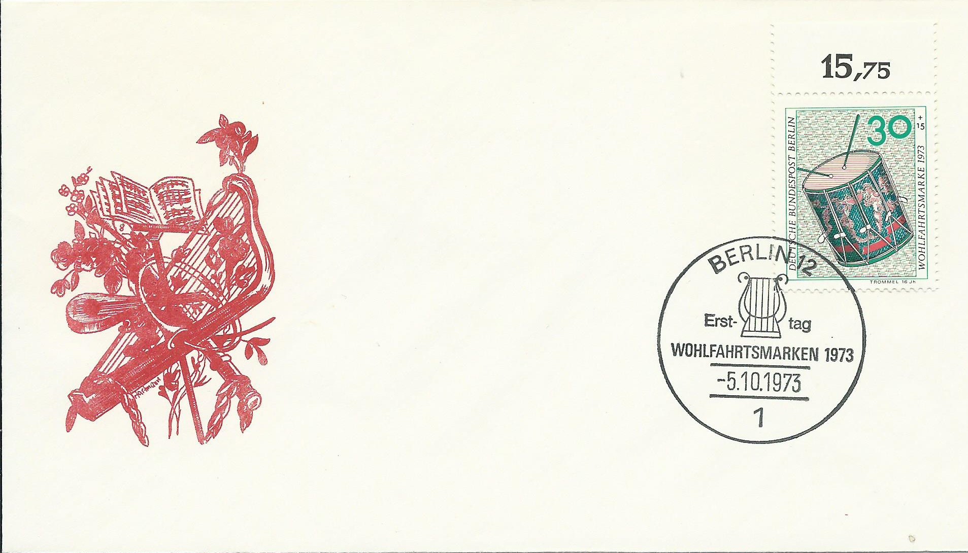 Von der Michel-Nummer 463 Weihnachten 1973 ist auch noch ein Ersttagsbrief vorhanden, ebenfalls mit aufgeklebtem Bild aus einer Zeitung. Die Marke stammt aus der rechten oberen Bogenecke. Gestempelt wurde mit dem Ersttagssonderstempel Berlin vom 9.11.73.