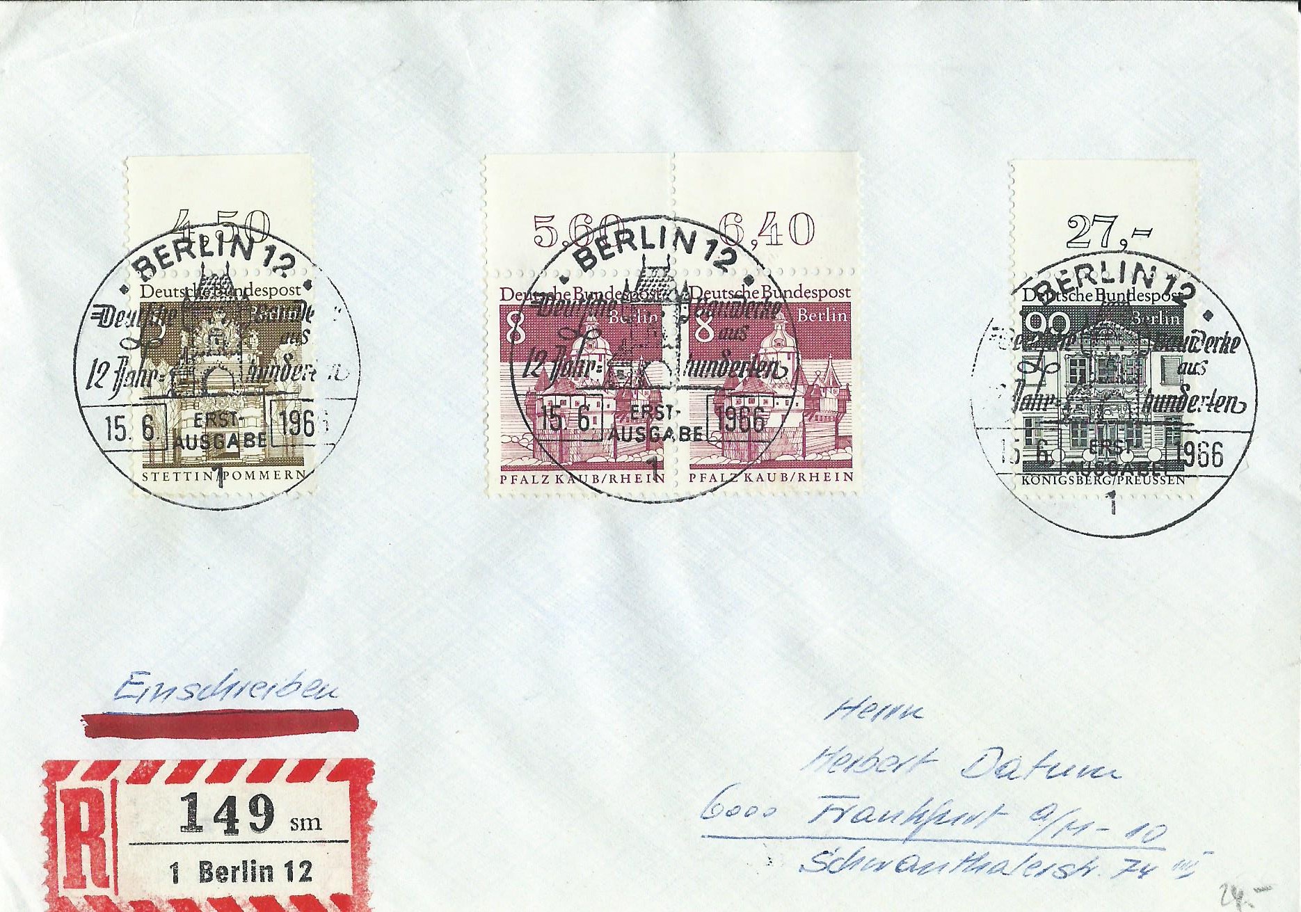 3 Werte der Dauerserie Deutsche Bauwerke aus 12 Jahrhunderten im Großformat wurden am 15.6.66 verausgabt. Es waren die Marken zu 5, 8 und 90 Pf. Diese kleben auf dem hier gezeigten Ersttagsbrief vereint, je eine zu 5 und 90 sowie ein waagerechtes Paar zu 8 Pf, alle Marken vom Bogenoberrand mit Reihenwertzähler. Der Brief wurde per Einschreiben befördert und ist leicht überfrankiert. Gestempelt wurde mit dem Ersttagssonderstempel Berlin am 15.6.66.