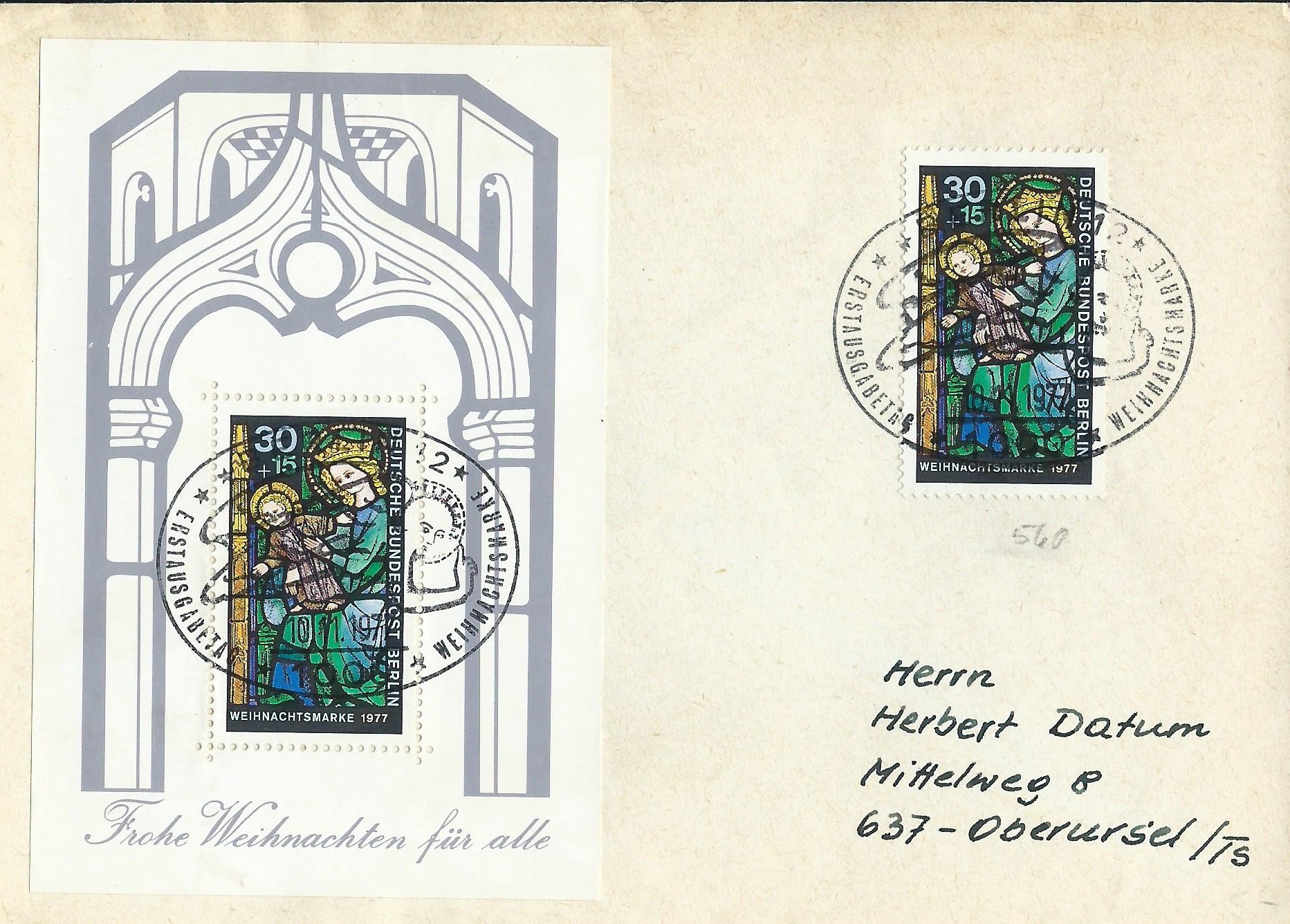 Der Weihnachtsblock von 1977 als Ganzes und eine Blockeinzelmarke wurden für diesen Ersttagsbrief als Frankatur genutzt (leider somit um 10 Pf überfrankiert). Gestempelt wurde mit dem Ersttagssonderstempel Berlin am 10.11.77.