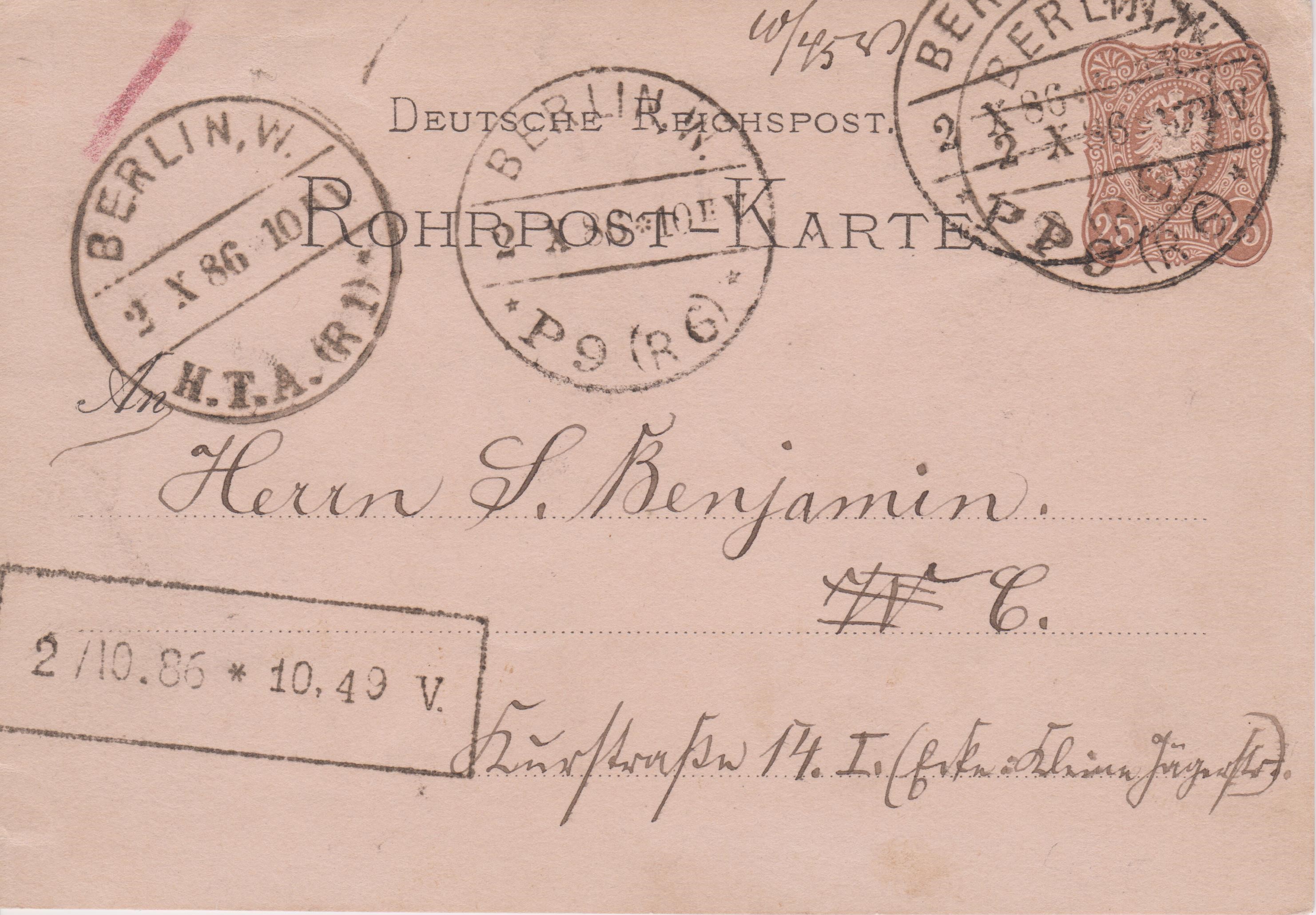 Ganzsache ROHRPOST-KARTE, adressiert "W" am 02.10.1886 aufgegeben in BERLIN, W. P 9 (R 6):