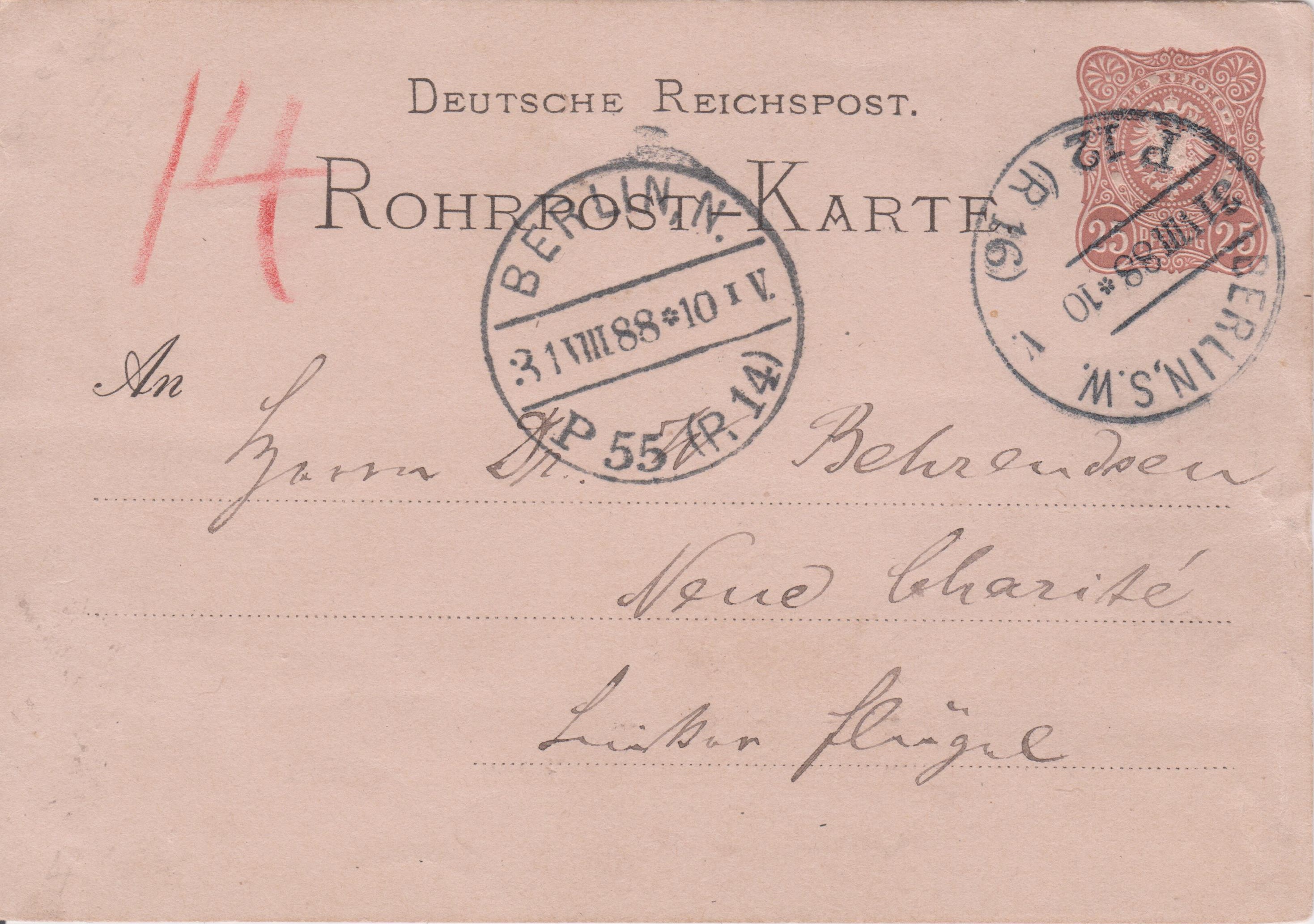 "ROHRPOST-KARTE", adressiert nach "Neue Charité Linker Flügel", aufgegeben am 31.08.1888 in BERLIN, S. W. P 12 (R 16):